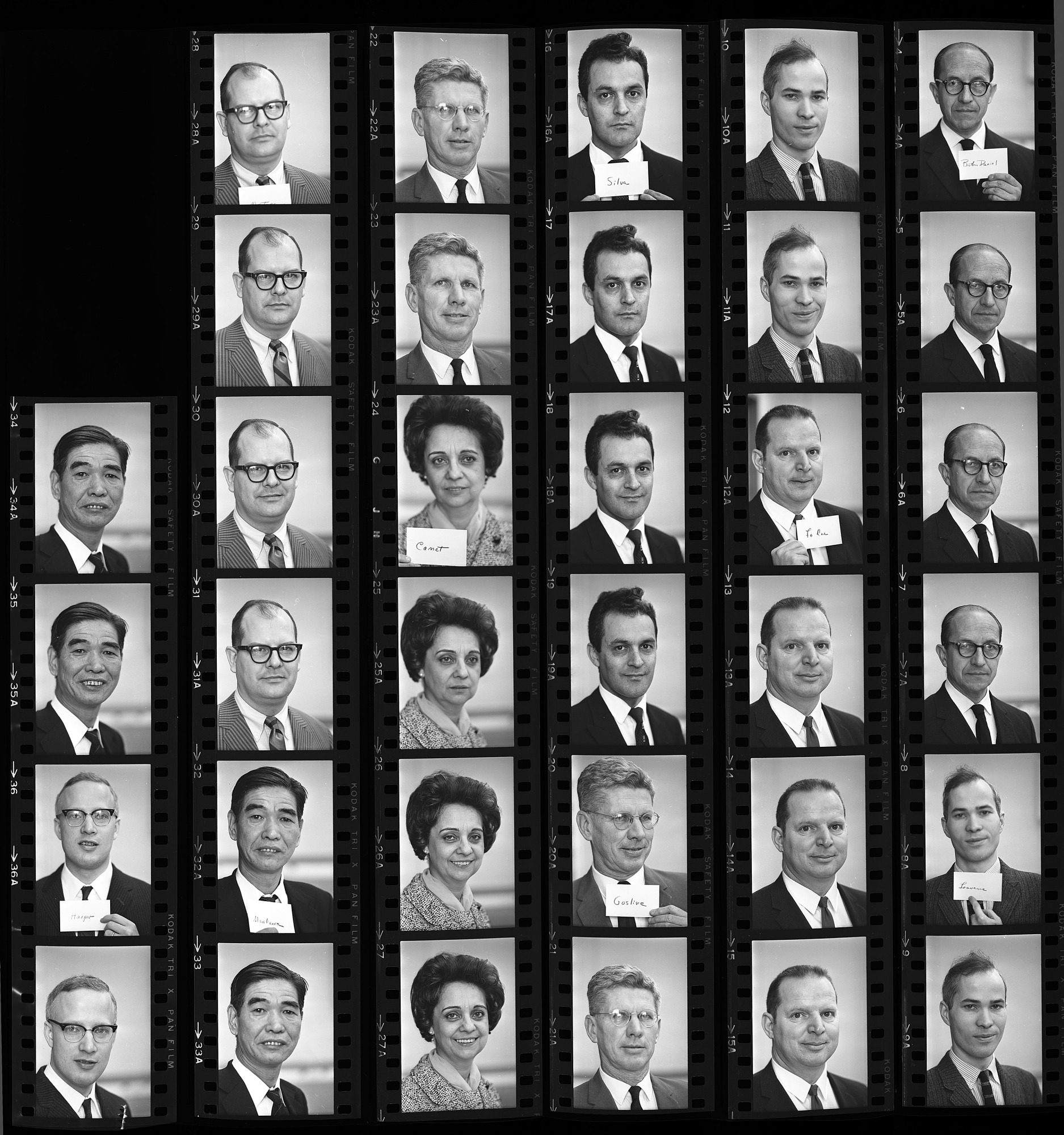 Portraits of visiting scientists and scholars participating in the newly scheduled education program through the Division of Education and Training: Rokaro Morikawa, Charles W. Harper, Frank Maturo Jr., William A. Gosline, Isabel Canet, Jayme de Loyola, Peter B. Leavens, Charles La Rue, and Brother Daniel Gonzalez.