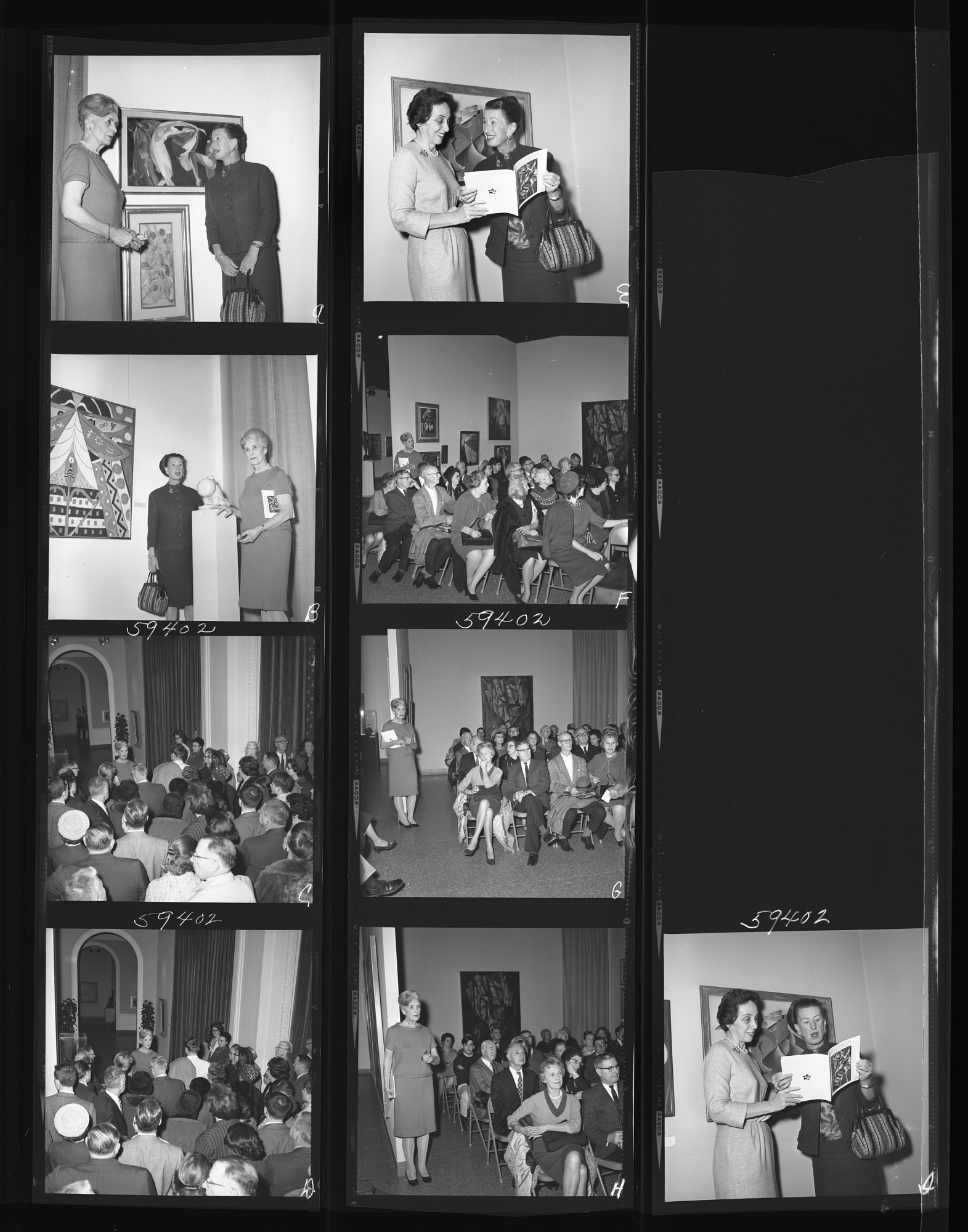 Tour by Adelyn D. Breeskin, special consultant to the National Collection of Fine Arts, now known as the Smithsonian American Art Museum, of NCFA exhibition "Roots of Abstract Art in America 1910-1930" for the Society of Associates in Art Hall of the Museum of Natural History, now known as the National Museum of Natural History, with Dorothy Robinson Kidder.