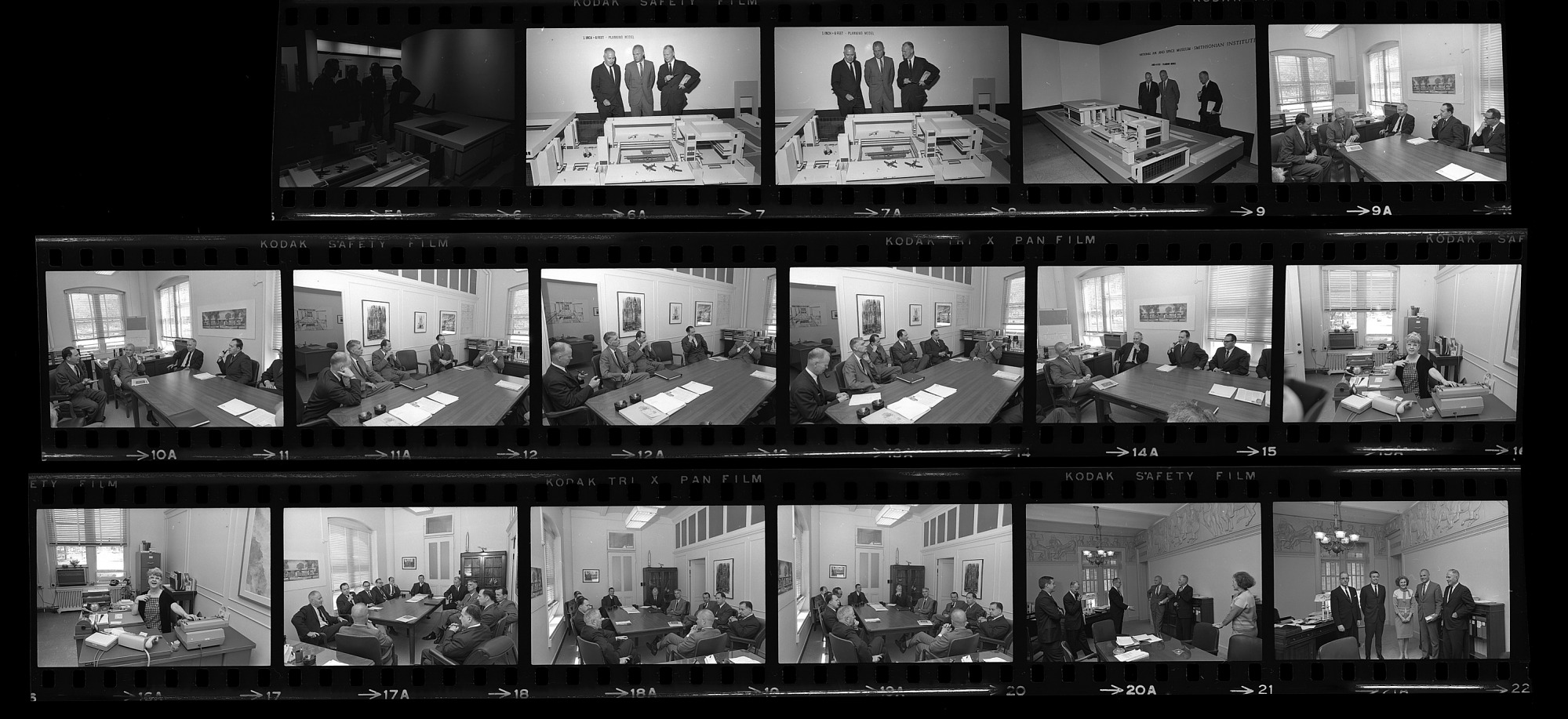 National Advisory Board to the National Air Museum (NAM) meeting with Colonel John Glenn, NAM Director S. Paul Johnston, NAM Assistant Director (Astronautics) Frederick C. Durant III, and Assistant Secretary James C. Bradley. Board members view a planning model of the proposed National Air and Space Museum building.