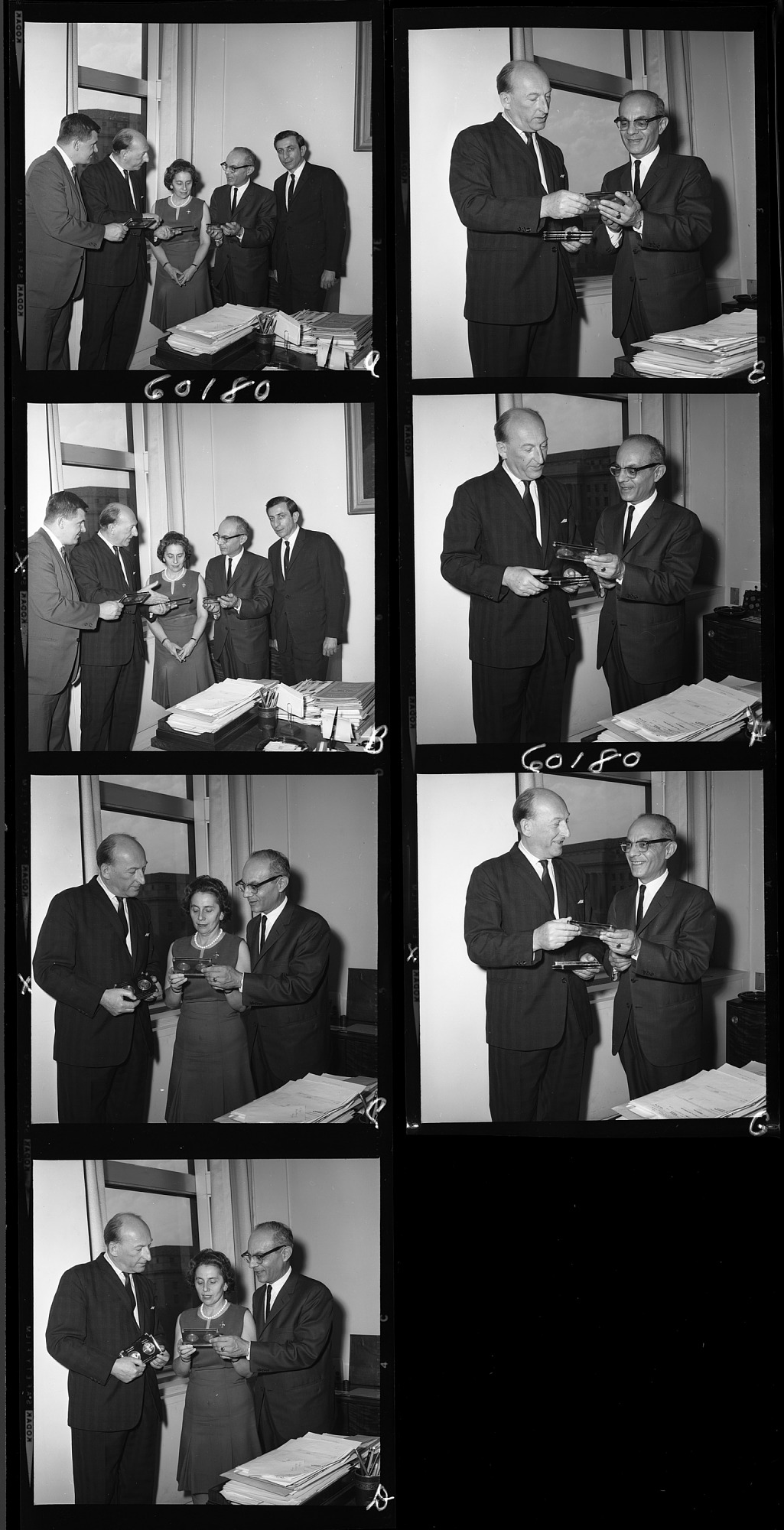 Presentation of coins to Dr. Vladimir Clain-Stefanelli and Elvira E. Clain-Stefanelli, curators of Numismatics at the Museum of History and Technology, now known as the National Museum of American History.
