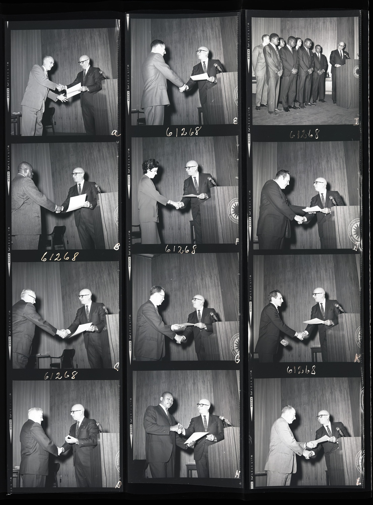 Sidney R. Galler, Assistant Secretary for Science, hands out awards at the Museum of History and Technology (MHT), now known as the National Museum of American History, with Silvio A. Bedini, Assistant Director of MHT.
