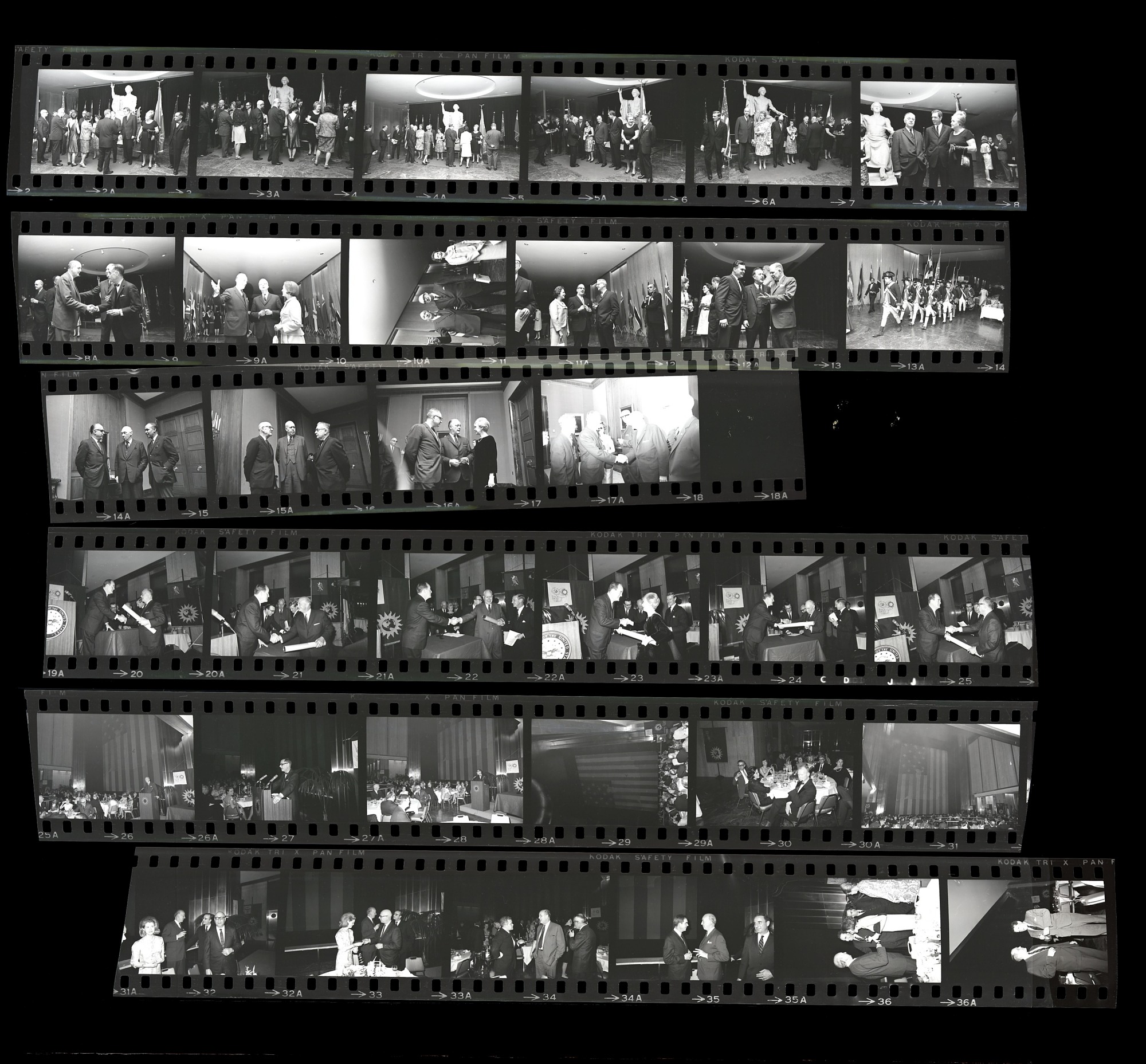 Dinner in celebration of George Washington's birthday at Museum of History and Technology, now known as the National Museum of American History, with Vice President Hubert H. Humphrey, Secretary S. Dillon Ripley, and Assistant Secretary for Science Sidney R. Galler.