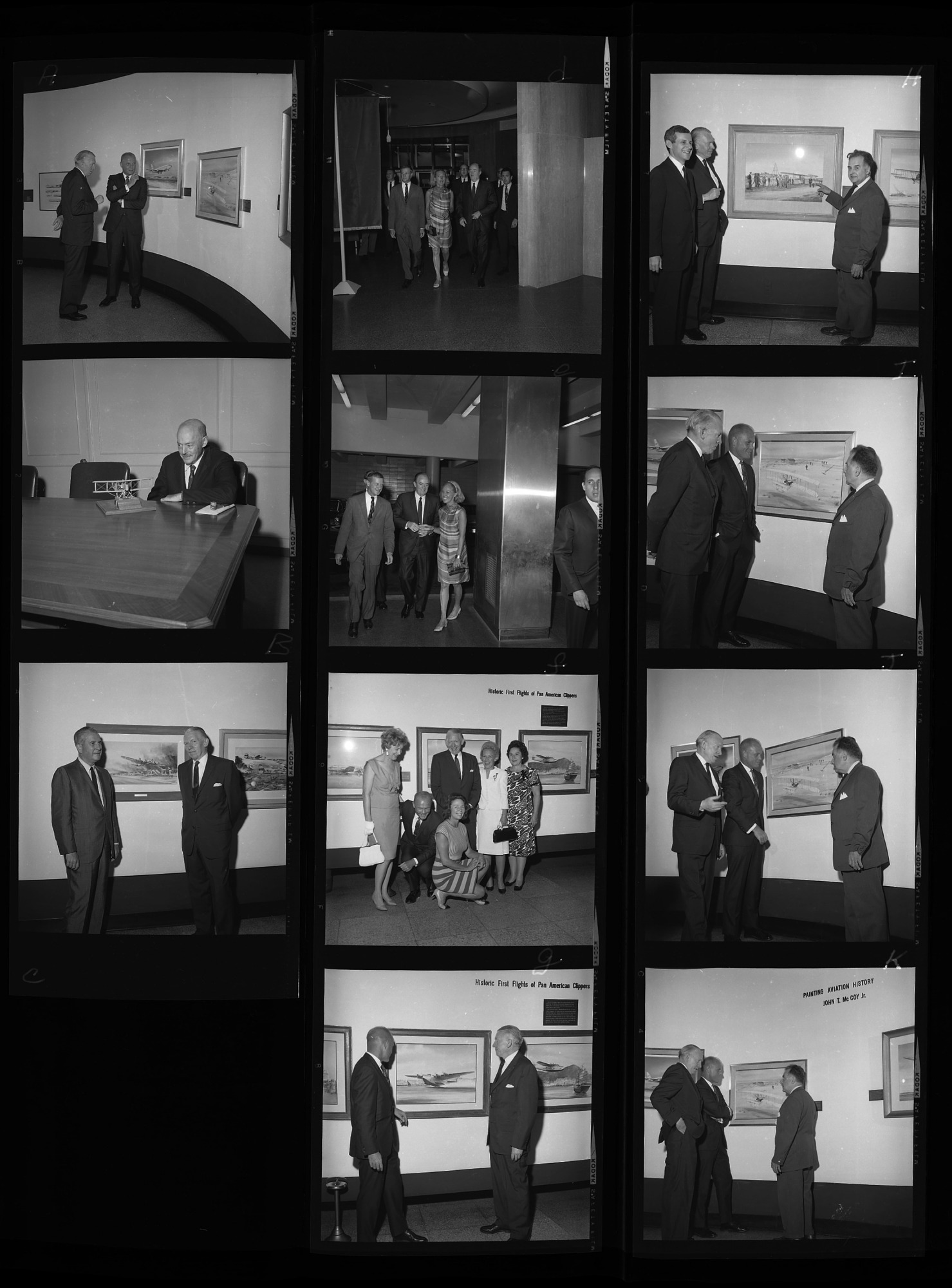 "Painting Aviation History" exhibition reception featuring watercolors by Colonel John T. McCoy, Jr., USAF (Ret.) at the National Air and Space Museum (NASM) hall in the Arts and Industries Building, with Colonel John Glenn, artist John T. McCoy, and Paul E. Garber, NASM curator.