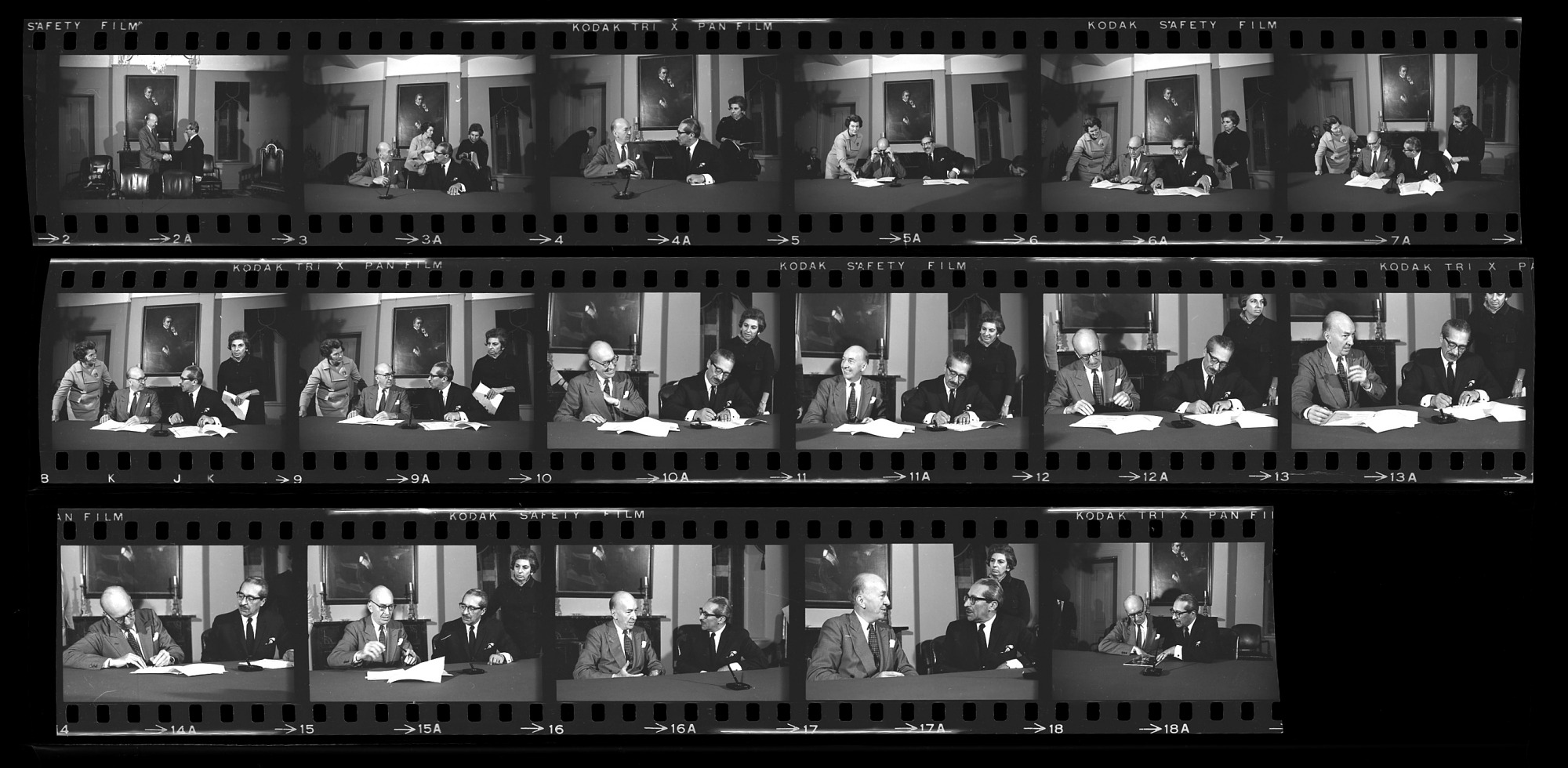Signing agreement for traveling exhibit from Ecuador with the Ambassador of Ecuador and Secretary S. Dillon Ripley.