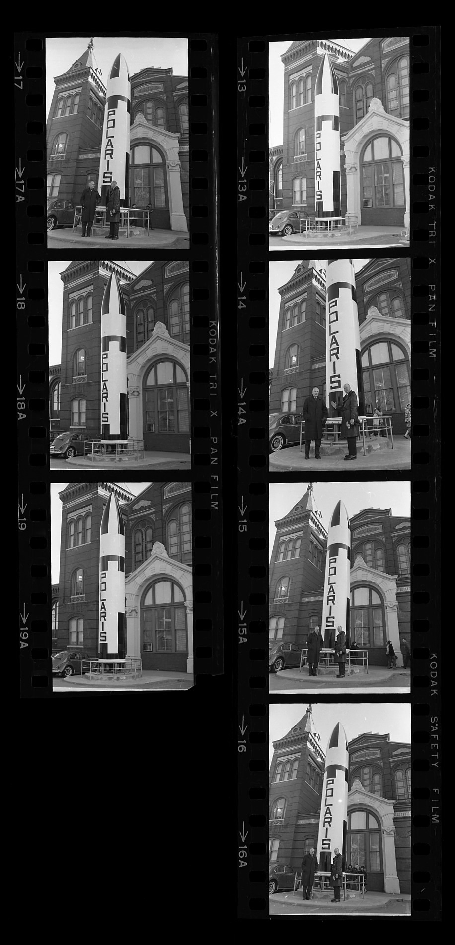 Polaris missile, the first U.S. submarine-launched ICBM, outside the Arts and Industries Building, National Air and Space Museum Director S. Paul Johnston and Frederick C. Durant III, Assistant Director of Astronautics.