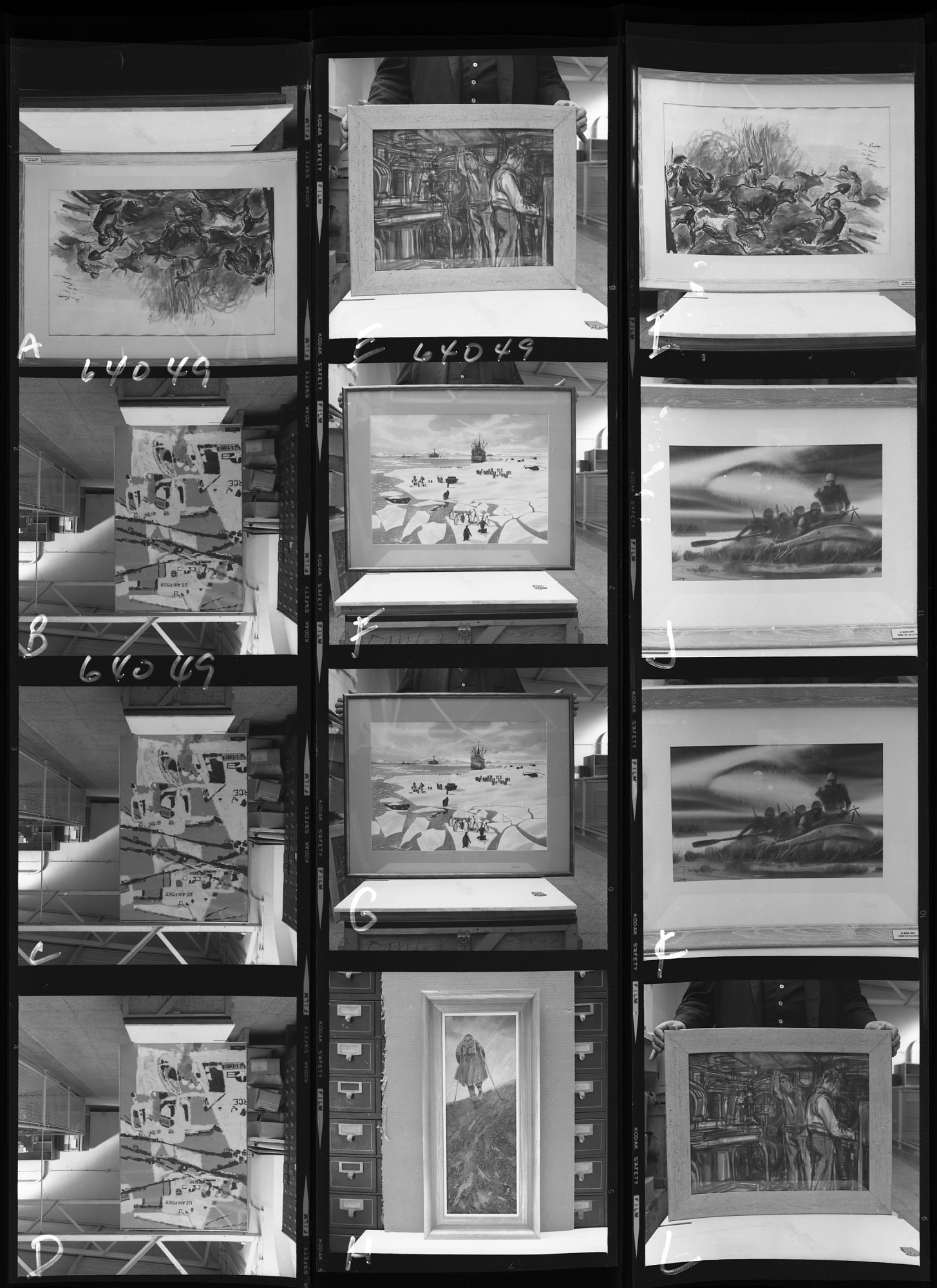 Paintings from the "The Armed Forces of the United States as Viewed by the Contemporary Artist" exhibition arranged by the National Armed Forces Museum Advisory Board (NAFMAB), to be displayed in the Arts and Industries Building, featuring "This Takes Guts," a U.S. Navy painting by Charles Waterhouse.
