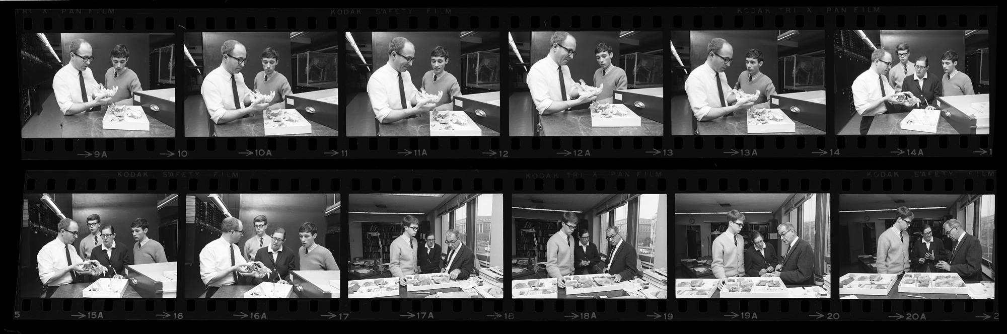 Clayton E. Ray, curator in the Department of Paleobiology at the Museum of Natural History, examines a mammal fossil found at Ladds Quarry in Georgia with visiting scientist Dr. Emma Lewis Lipps, professor of biology and earth sciences at Shorter College in Rome, Georgia, and unidentified students; G. Arthur Cooper, Senior Paleobiologist, examines specimens with Dr. Lipps and unidentified student.