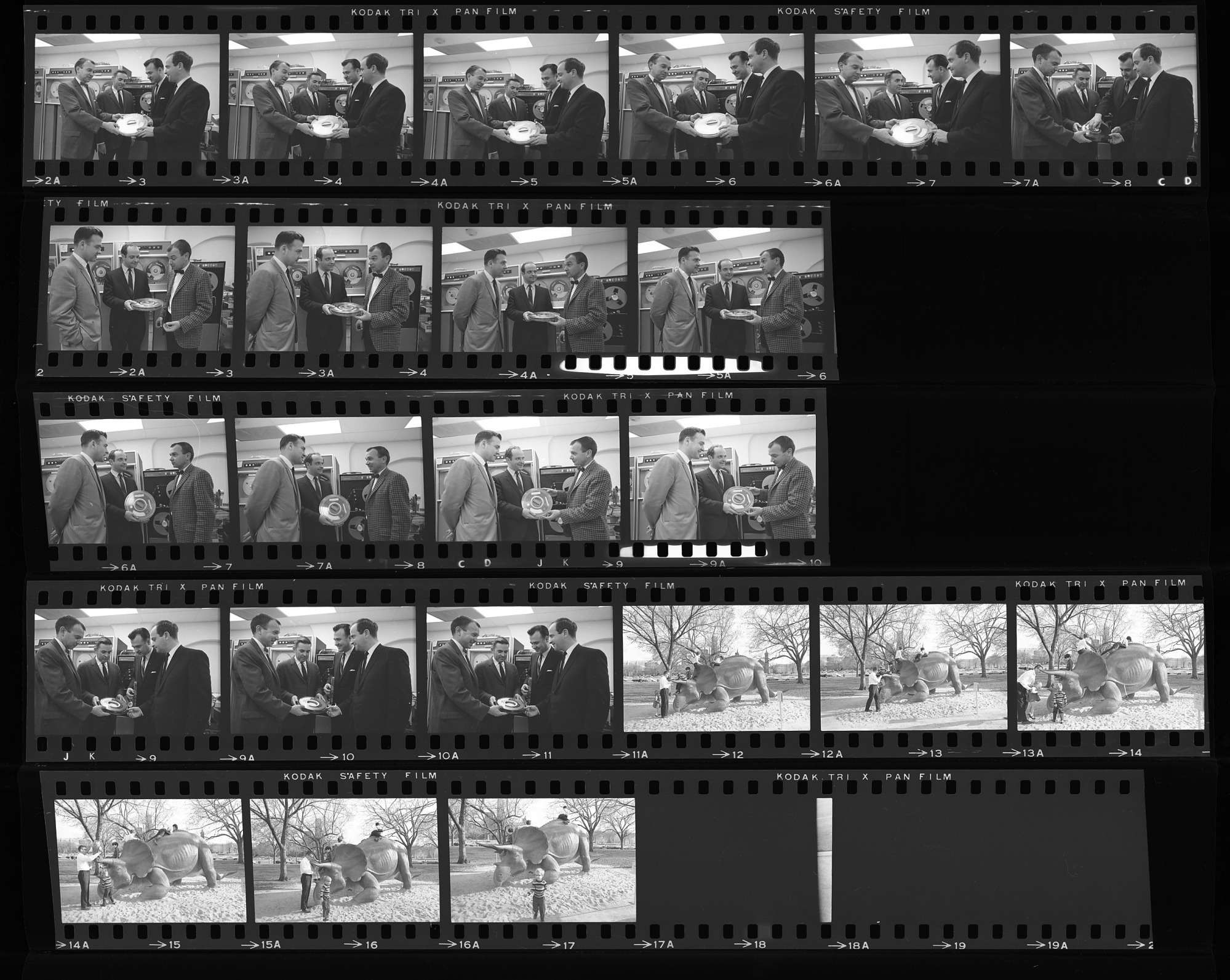 SI Computer Lab in the Arts and Industries Building featuring the Honeywell 1200 computer, with Dr. Donald F. Squires, Deputy Director of the Museum of Natural History (MNH), Eugene P. Kennedy, Chief of the U.S. Office of Education's Library and Information Services Research Branch, Nicholas Suszynski, DIrector of SI's Information Systems Division, and Reginald Creighton, senior systems analyst for the MNH project; Children play on and around Uncle Beazley, a 25 foot long replica of a triceratops on the National Mall.