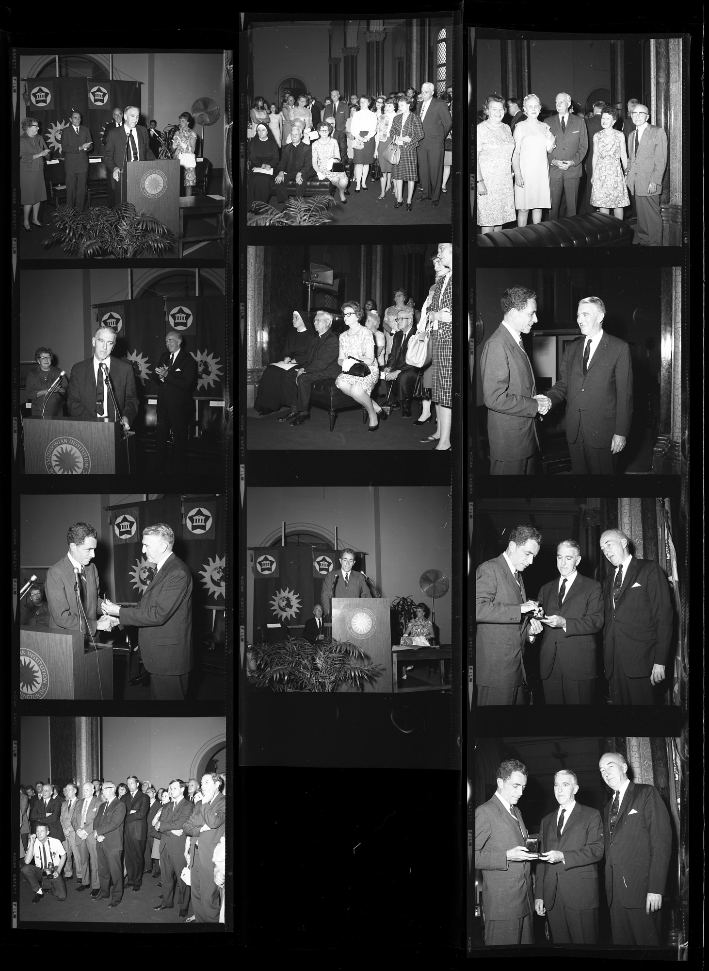 Senator Claiborne Pell presents the Joseph Henry Medal to Frank A. Taylor, Director General of Museums, with Secretary S. Dillon Ripley and Leonard Carmichael, seventh Smithsonian Secretary.