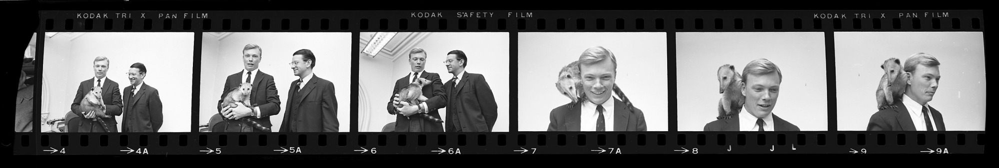 Robert W. Mason, Executive Assistant to the Secretary, and Philip C. Ritterbush, Director of the Office of Academic Programs, with "Cosumbo," a mountain coatimundi, collected on their mountain-climbing expedition in Colombia.