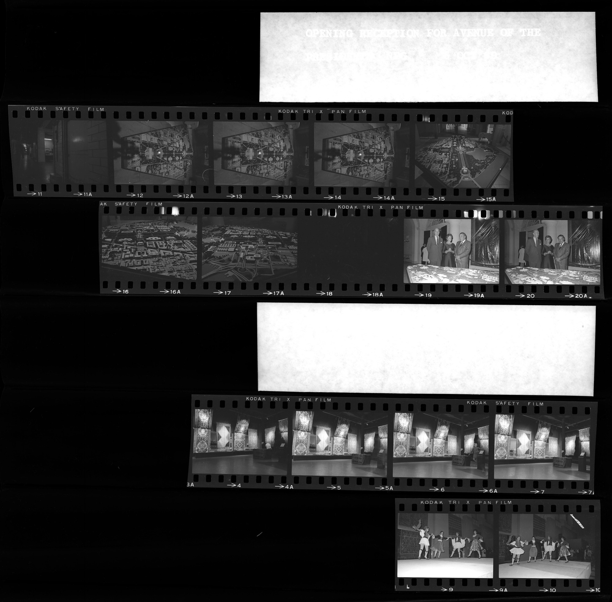 Opening reception for "Avenue of the Presidents" exhibition at the National Portrait Gallery, with Secretary S. Dillon Ripley, featuring an architectural model of the National Mall area and parts of downtown Washington, D.C., October 6, 1969. ; Museum Shops sales exhibition featuring flat-woven rugs from Greece, Iran, and Turkey, sponsored by Smithsonian Associates, in the Arts and Industries Building, with performance by dancers in regional costumes, October 7, 1969.