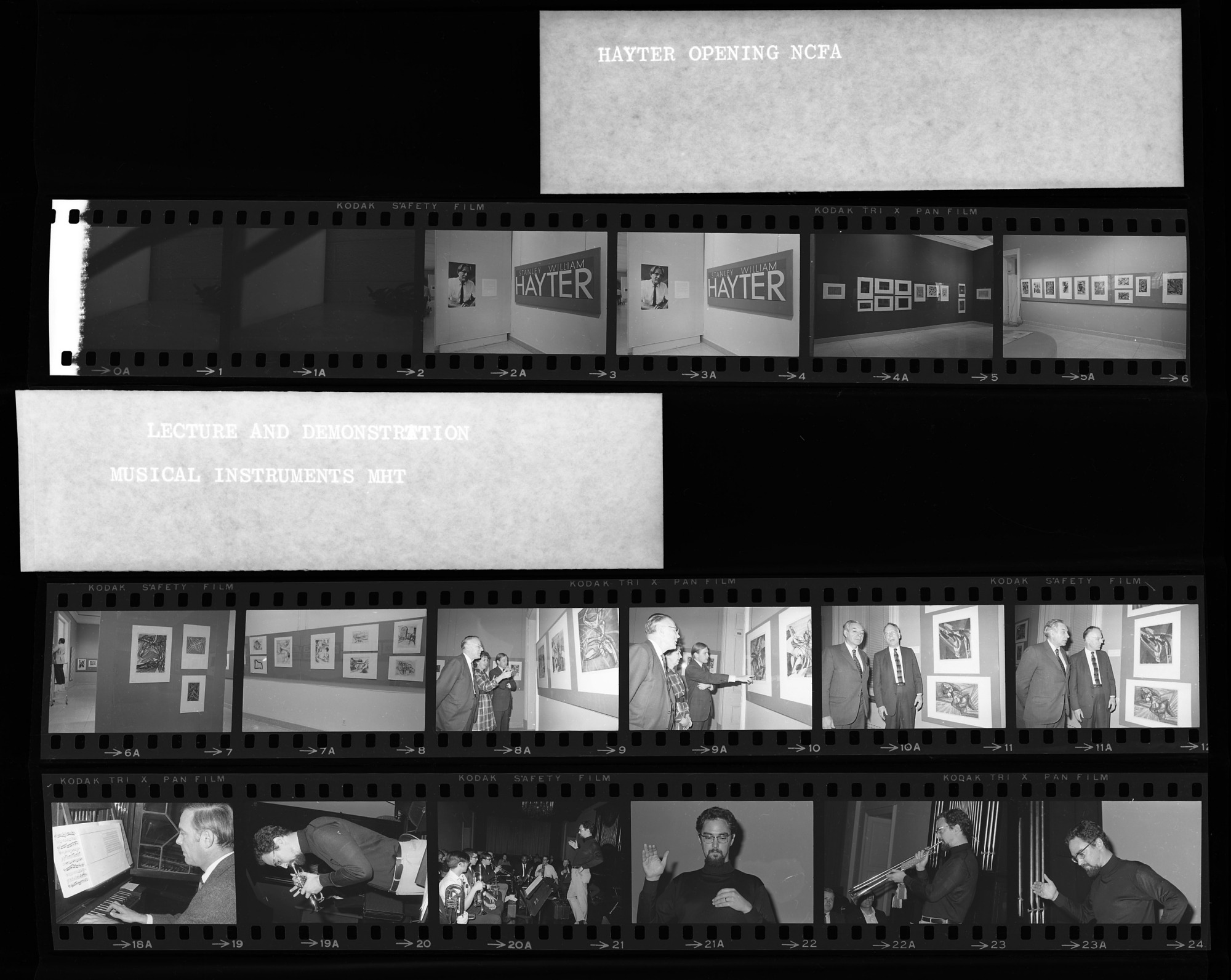 "Stanley William Hayter" exhibition opening at the National Collection of Fine Arts (NCFA), with curator Jacob Kainen. ; Lecture and demonstration from the Division of Musical Instruments at the National Museum of History and Technology.
