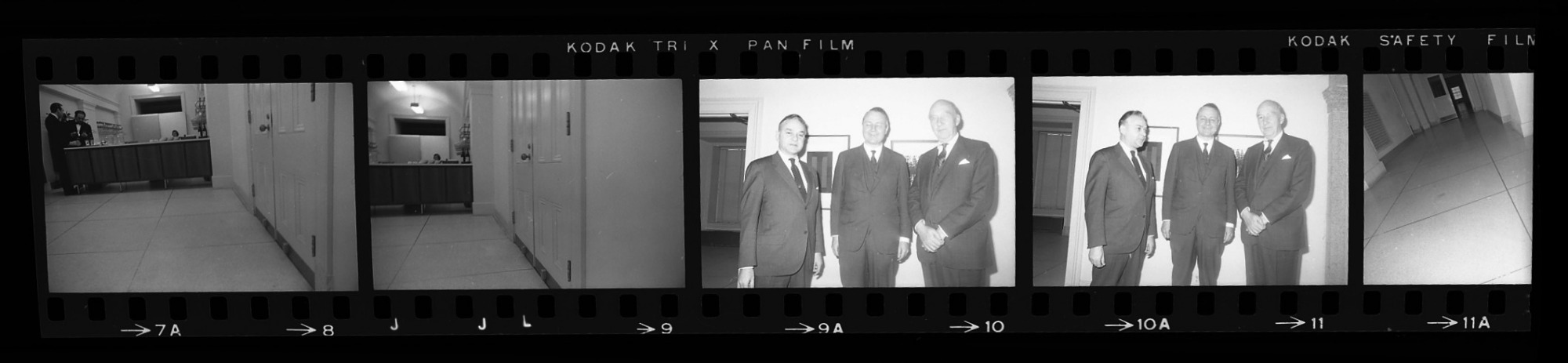 Group portrait taken during luncheon honoring John William Middendorf II, U.S. Ambassador to the Netherlands, held in the Granite Gallery of the National Collection of Fine Arts (NCFA). With (left to tight) Joshua C. Taylor, NCFA director; John William Middendorf; and Secretary S. Dillon Ripley.