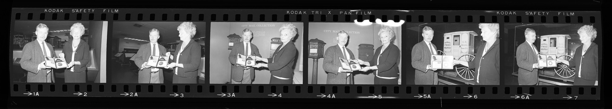 Carl H. Scheele, chairman of the Division of Postal History at the National Museum of History and Technology, is presented with a First Day Cover and medal representing the Moon Flight.