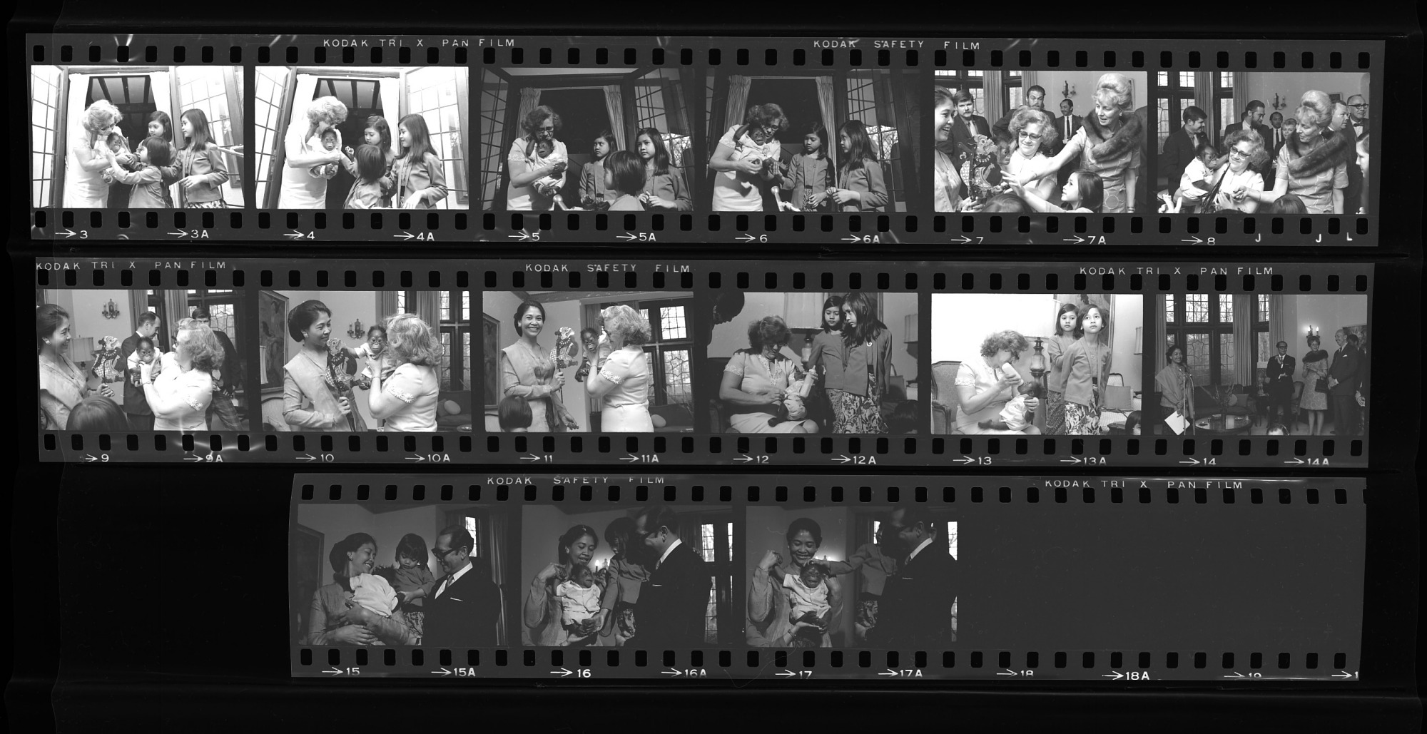 Christening ceremony for one month old male orangutan Bagong at the residence of Indonesia's Ambassador to the United States, Soedjatmoko, with foster mother Louise Gallagher, wife of the Headkeeper of the Division of Small Mammals and Primates at the National Zoological Park, Secretary S. Dillon Ripley, Mary Livingston Ripley, and Soedjatmoko, his wife, Ratmini Gandasubrata, and daughters. Bagong was born on March 4 to National Zoo orangutans Archie and Jennie.