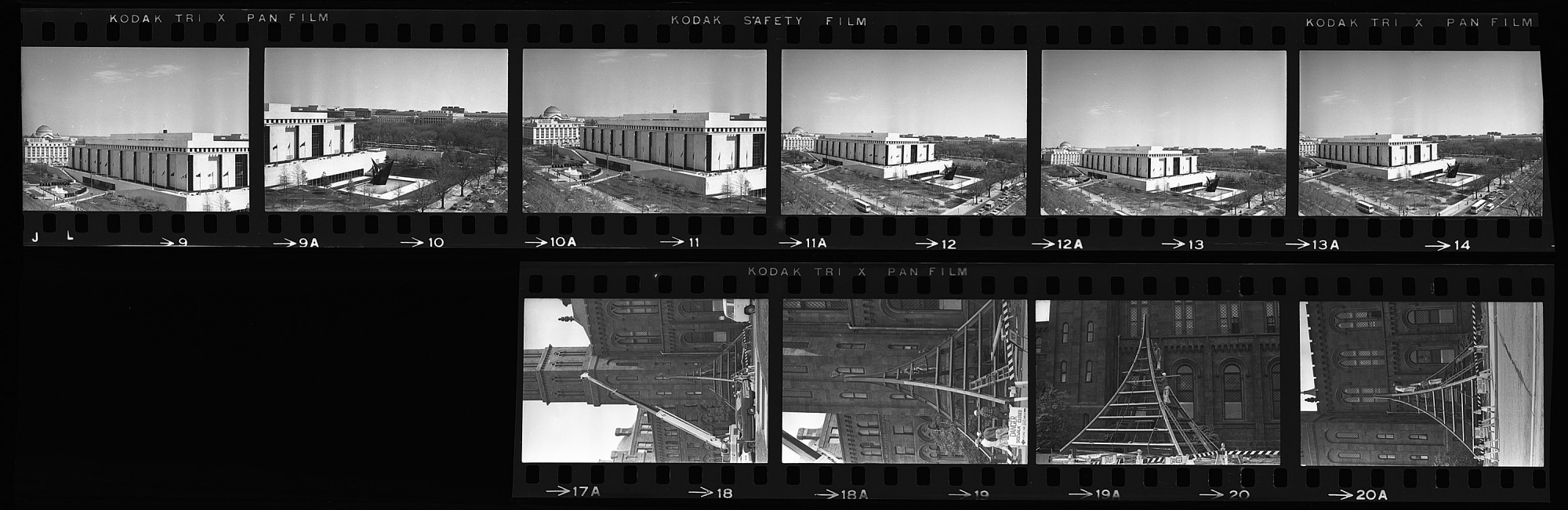 Exterior views of National Museum of History and Technology (NMHT), with views of Alexander Calder sculpture "Gwenfritz" [SAAM 1969.116] on the west side of NMHT. National Museum of Natural History in view behind NMHT. ; Construction of the replacement spire for the north tower of the Smithsonian Institution Building, or Castle. The original was destroyed by the Castle fire of 1865.