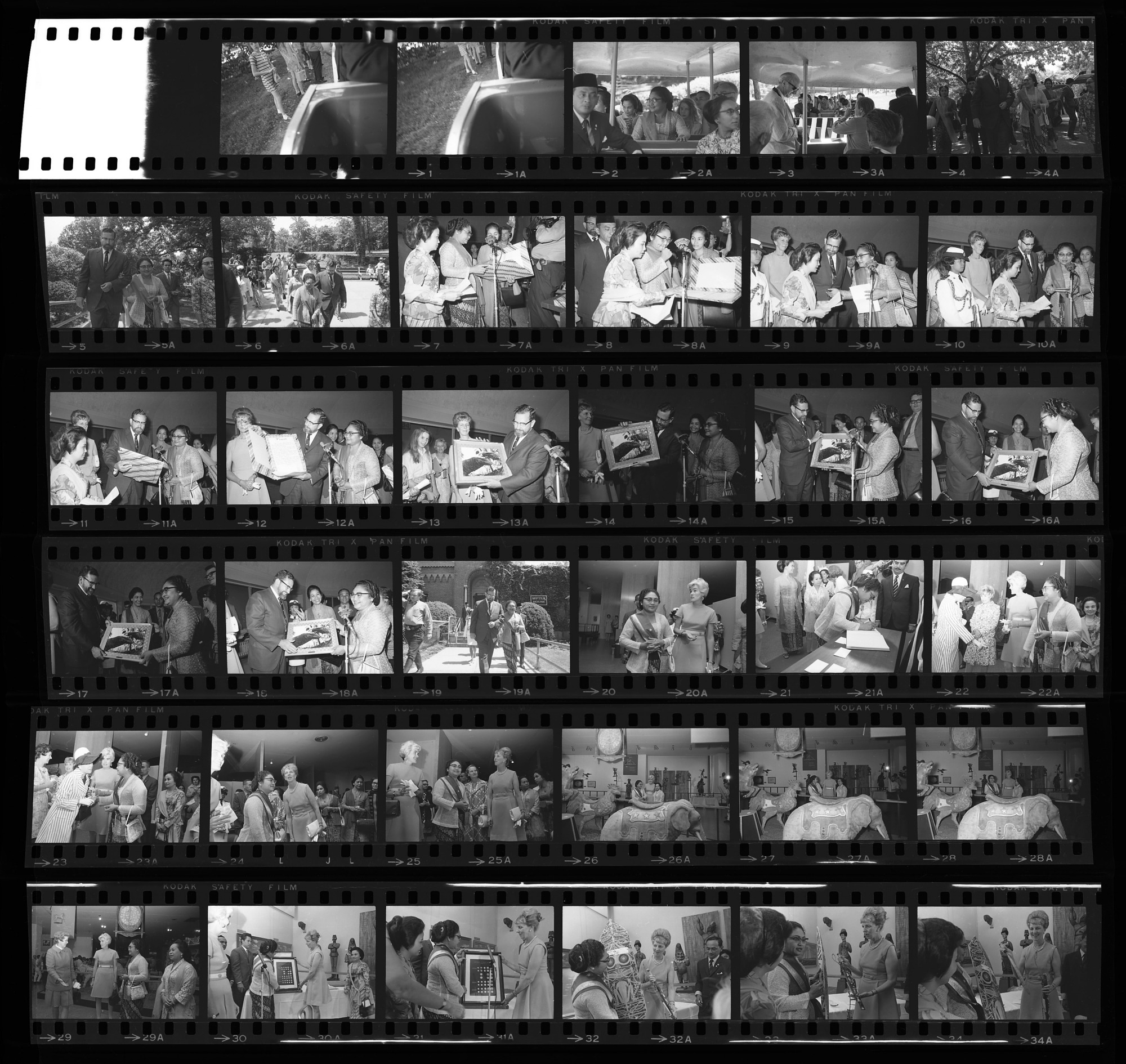 Siti Hartinah, wife of the President of Indonesia, presents National Zoological Park Director Dr. Theodore Reed with a photograph of a Komodo dragon. The government of Indonesia presented the National Zoo with a Komodo dragon as a mate for the lone female that the Zoo has had since 1967. With Ratmini Gandasubrata, wife of the Indonesian Ambassador, Soedjatmoko, and Mary Livingston Ripley. ; State Department luncheon and tour for Madame Suharto at National Museum of History and Technology.