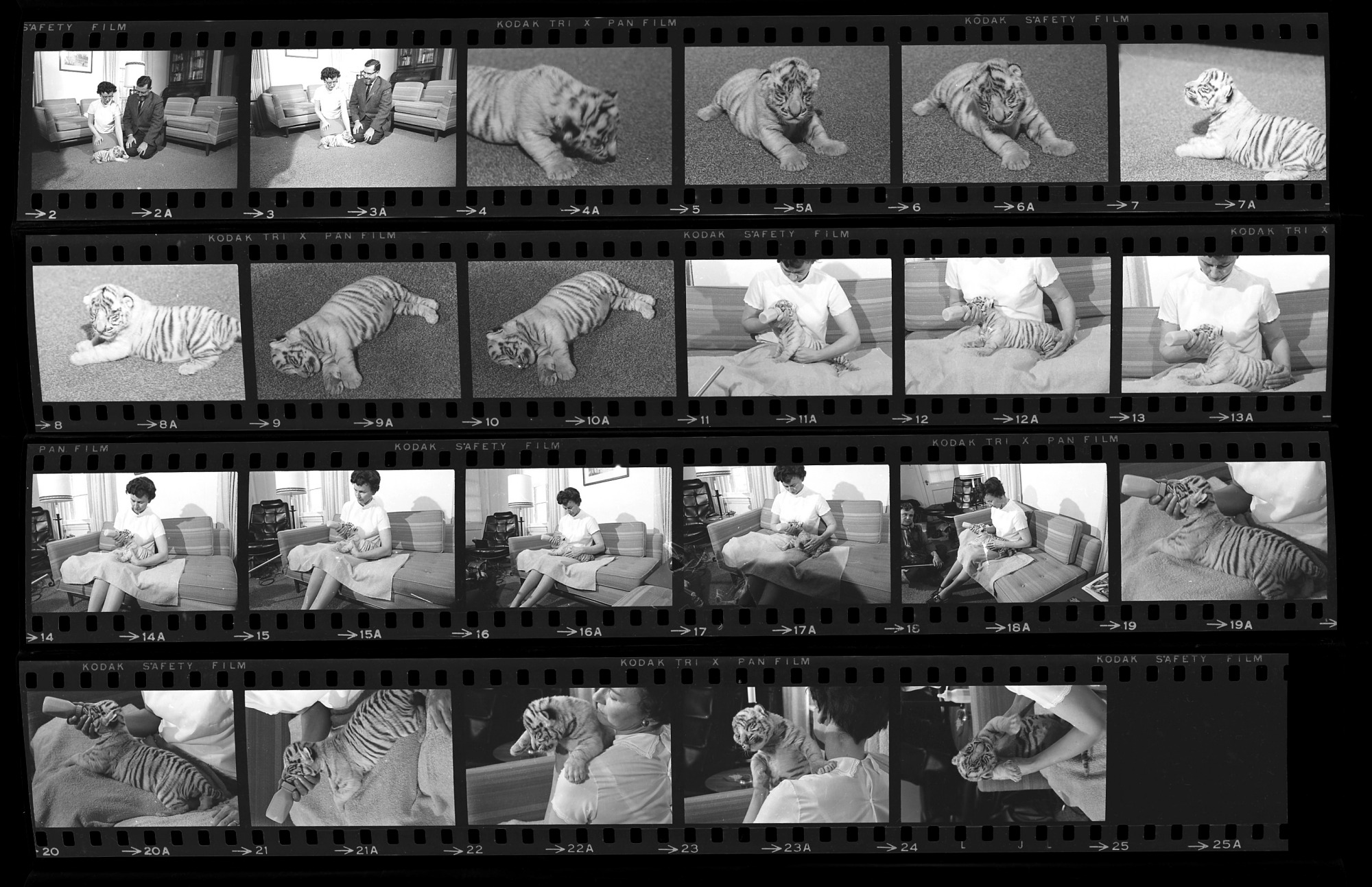 Elizabeth Reed and Dr. Theodore Reed, director of the National Zoological Park, with white tiger cub "Moni" at 13 days old in their home.