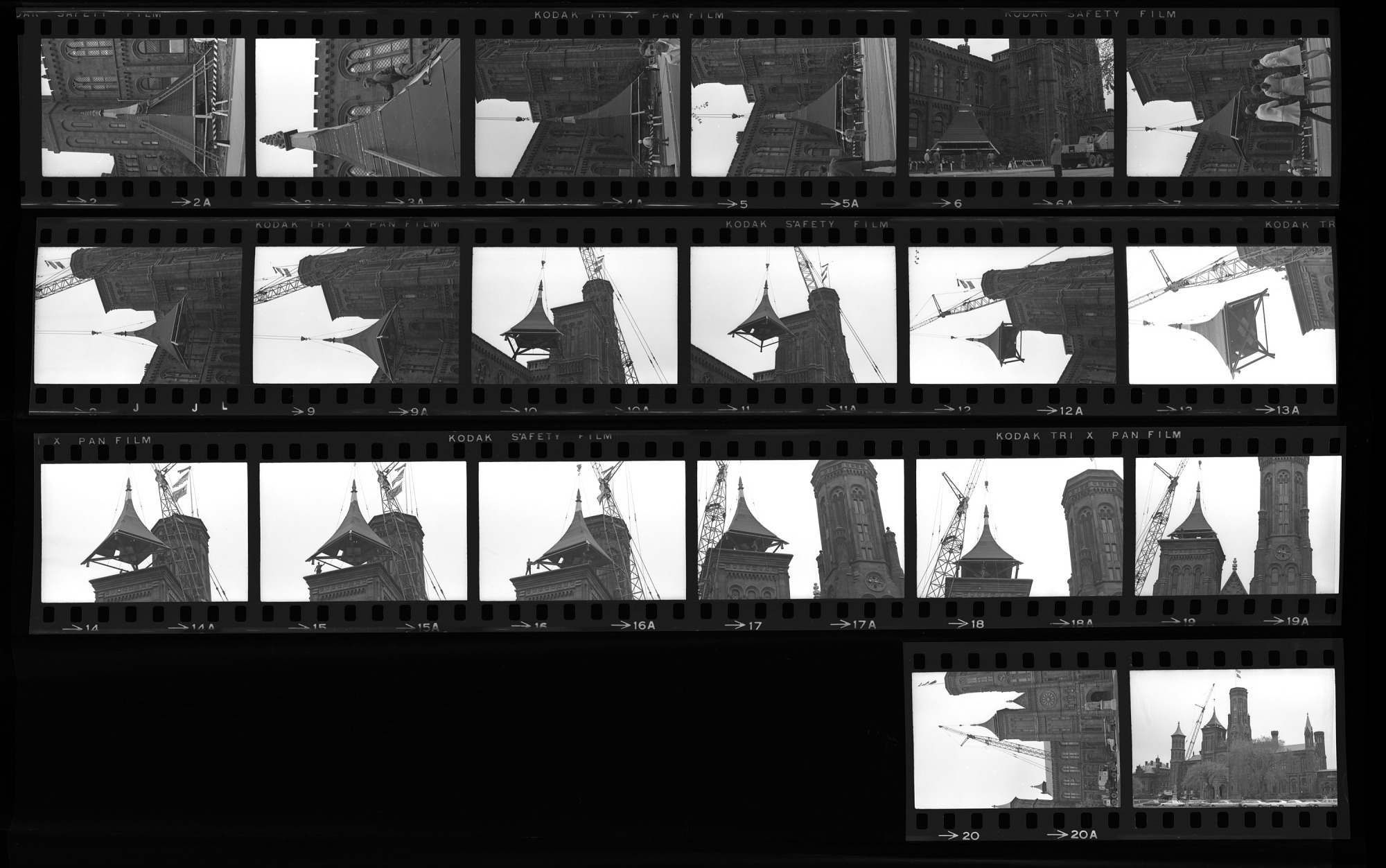 Raising of the replacement spire for the north tower of the Smithsonian Institution Building, or Castle. The original was destroyed by the Castle fire of 1865.