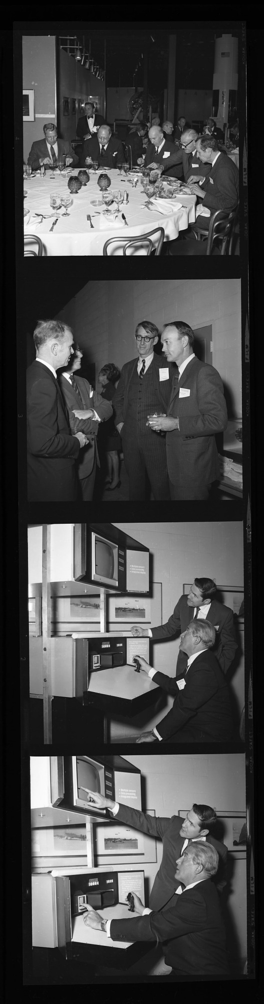 National Air and Space Museum (NASM) symposium, held in the Hall of Aerospace Art in the Arts and Industries Building. With Frederick C. Durant III, NASM Assistant Director, Michael Collins, NASM Director, Secretary S. Dillon Ripley, Assistant Secretary for Science David Challinor, Under Secretary James C. Bradley, and Wernher von Braun, Deputy Associate Administrator of the National Aeronautics and Space Administration (NASA).