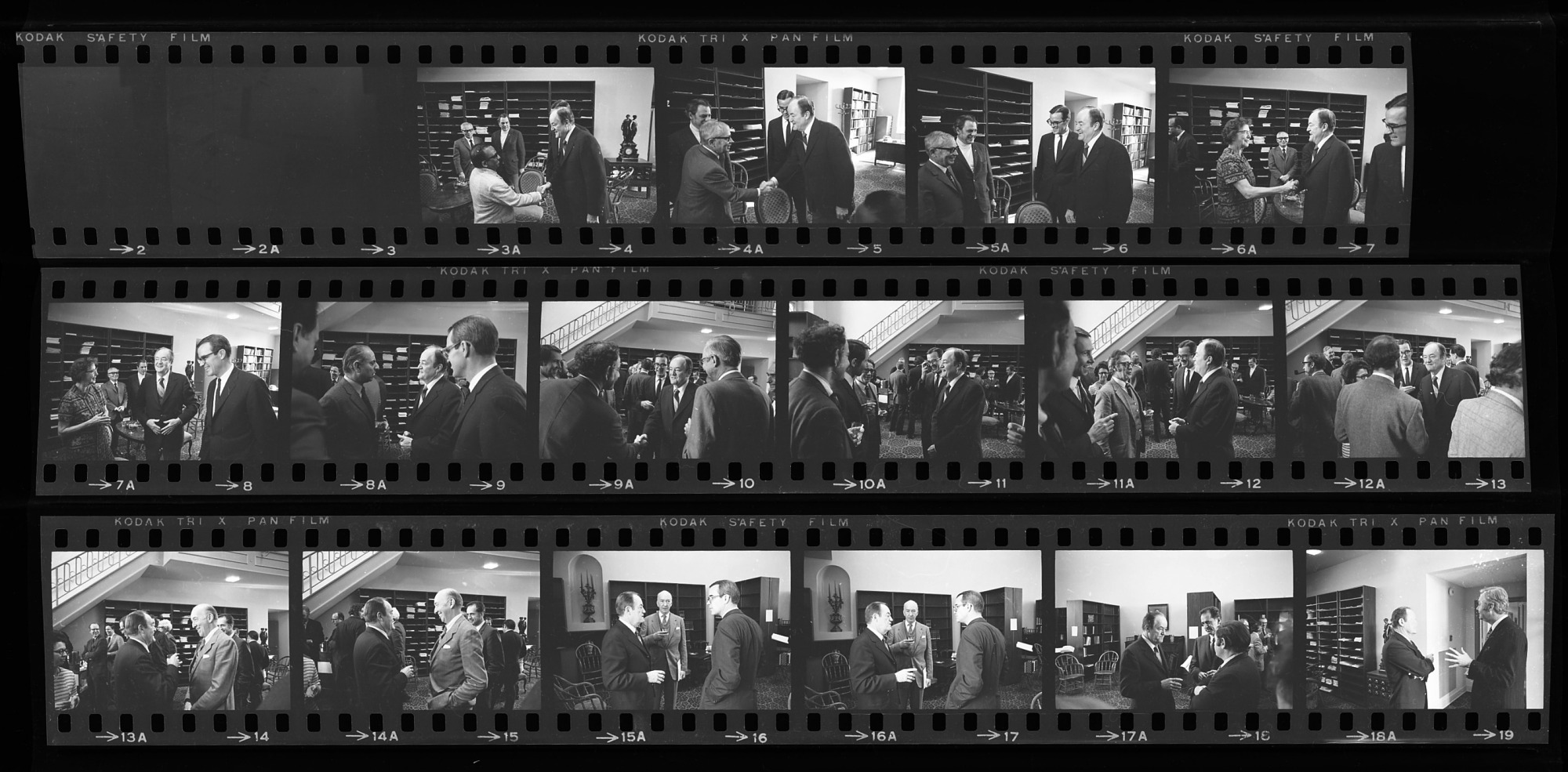 Former Vice President Hubert H. Humphrey greets members of the Woodrow Wilson International Center for Scholars (WWICS), with Secretary S. Dillon Ripley and WWICS Director Benjamin H. Read.