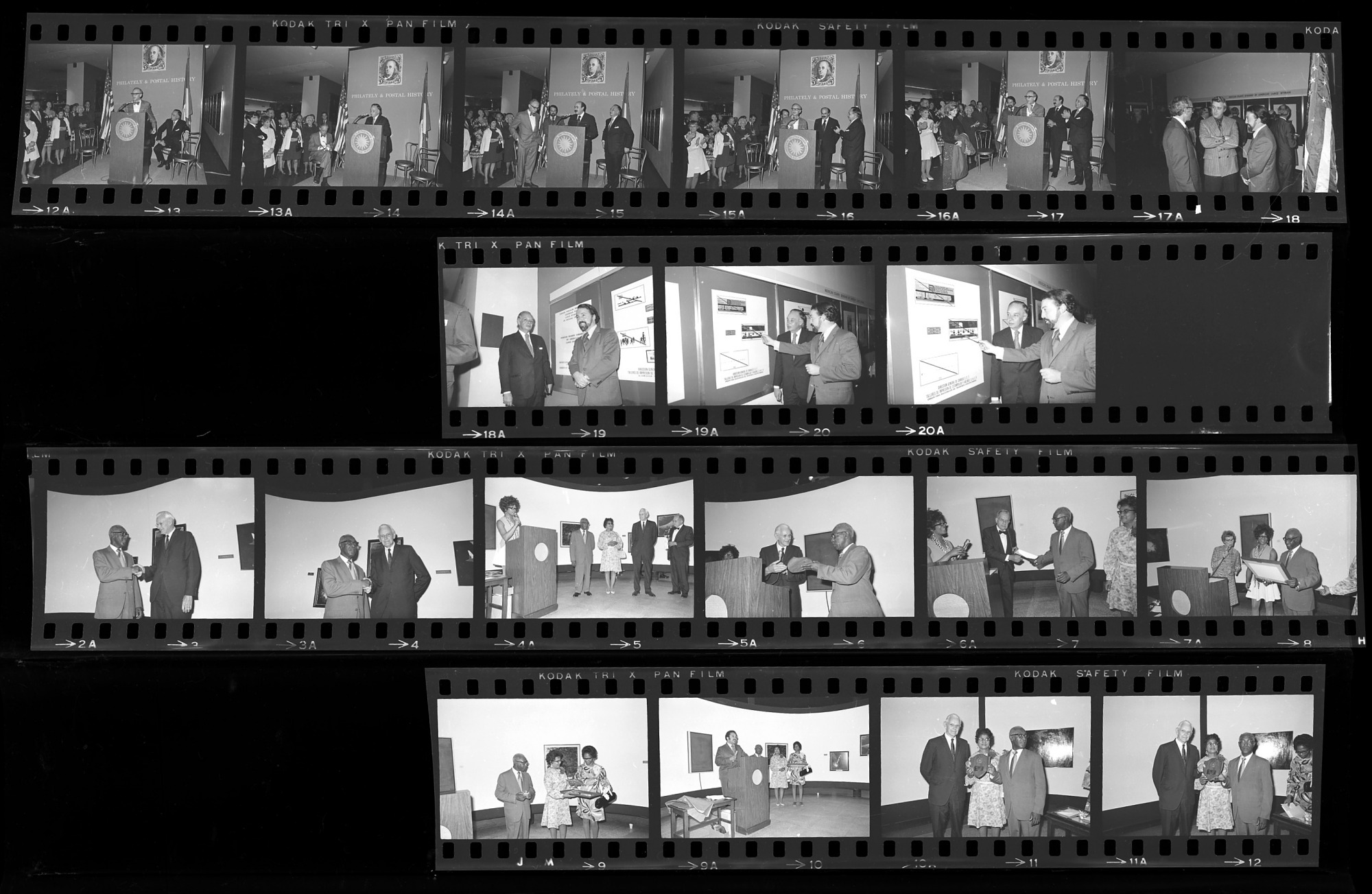 "Mexican Stamps Designed by American Lance Wyman" special exhibition opening event at National Museum of History and Technology (NMHT), now known as the National Museum of American History. Prepared by the Mexican postal administration, this exhibition honors American Lance Wyman, whose designs have been used for at least 50 Mexican postage stamps. Sponsored by Jose Juan de Olloqui, ambassador to the United States from Mexico, and Secretary of Communications and Transportation of Mexico. With Daniel J. Boorstin, NMHT director. ; Presentation of service award to Tilghman A. Hawkins, file clerk in the Office of the Registrar, for forty years of service at Smithsonian Institution. With wife Rosa Hawkins, former Secretary Alexander Wetmore, and Waldo L. Schmitt, honorary research associate in the Division of Marine Invertebrates.