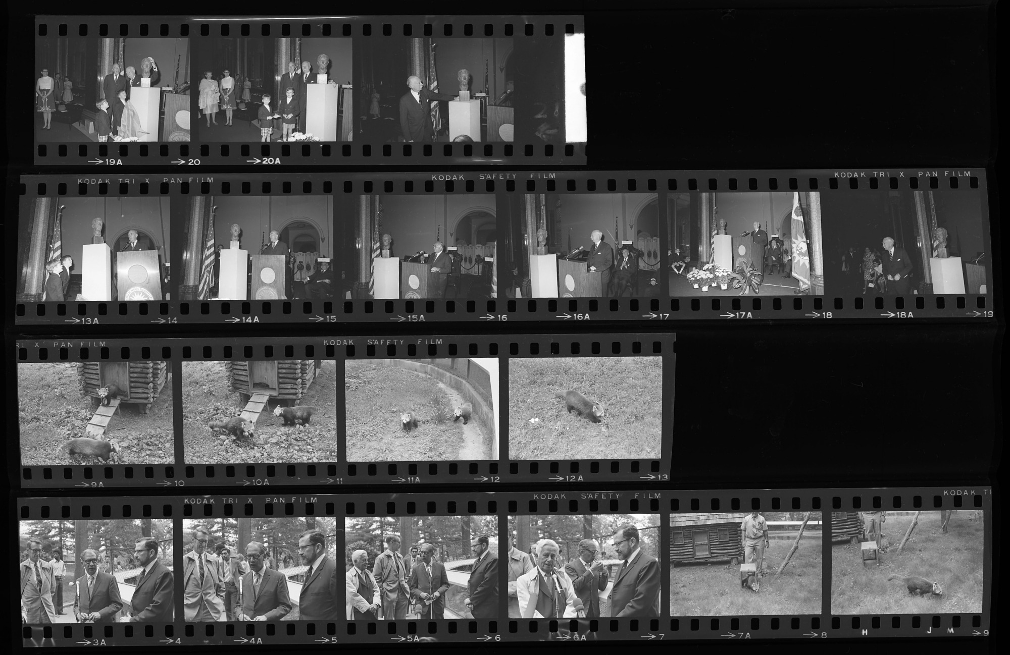 Presentation of female red panda to National Zoological Park (NZP) by the government of India, with NZP Director Theodore H. Reed and Assistant Secretary for Science David Challinor; Presentation and unveiling of bust of Leonard Carmichael, seventh Smithsonian Secretary, with Secretary S. Dillon Ripley.