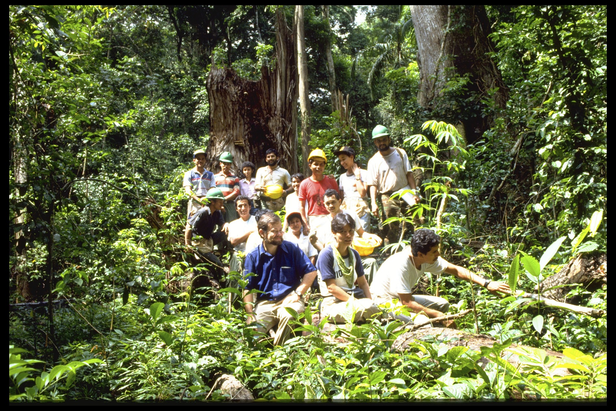 1990 census crew. BCI 50-ha plot. Robin Foster in blue, Zenith Batista, Eduardo Sierra, Raúl Moreno, Ester García, Ernesto Yayico (Perú), Edilberto Aguilar, Salomón Aguilar, Milagros Ruiz, José Solís, Elena Ruiz, Martín Mitre, Dilia Santamaría, Jorge Gonzales, Rolando Pérez.