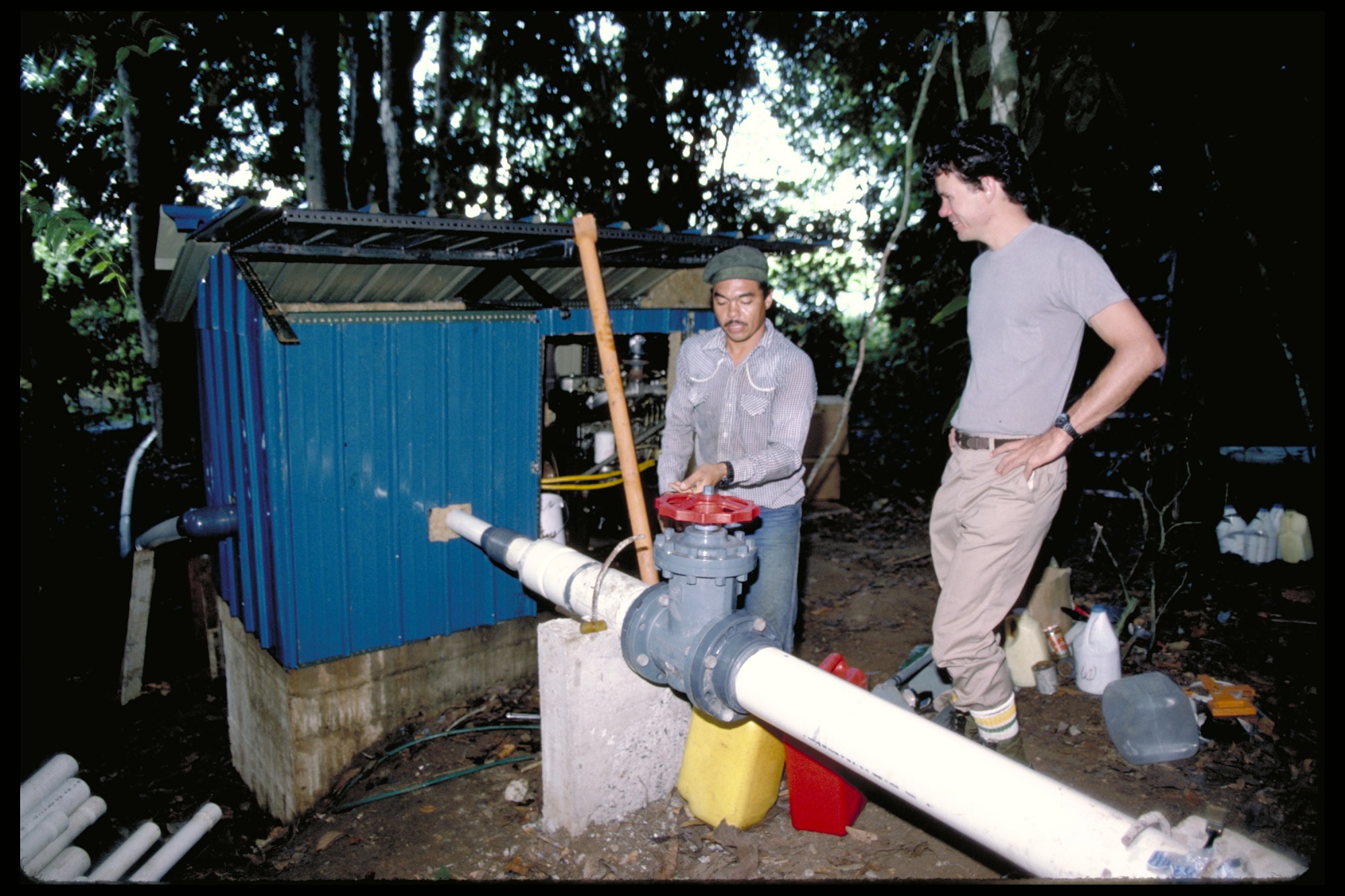Joe Wright and Carlos Gomez at main valve for forest stand-level irrigation system.