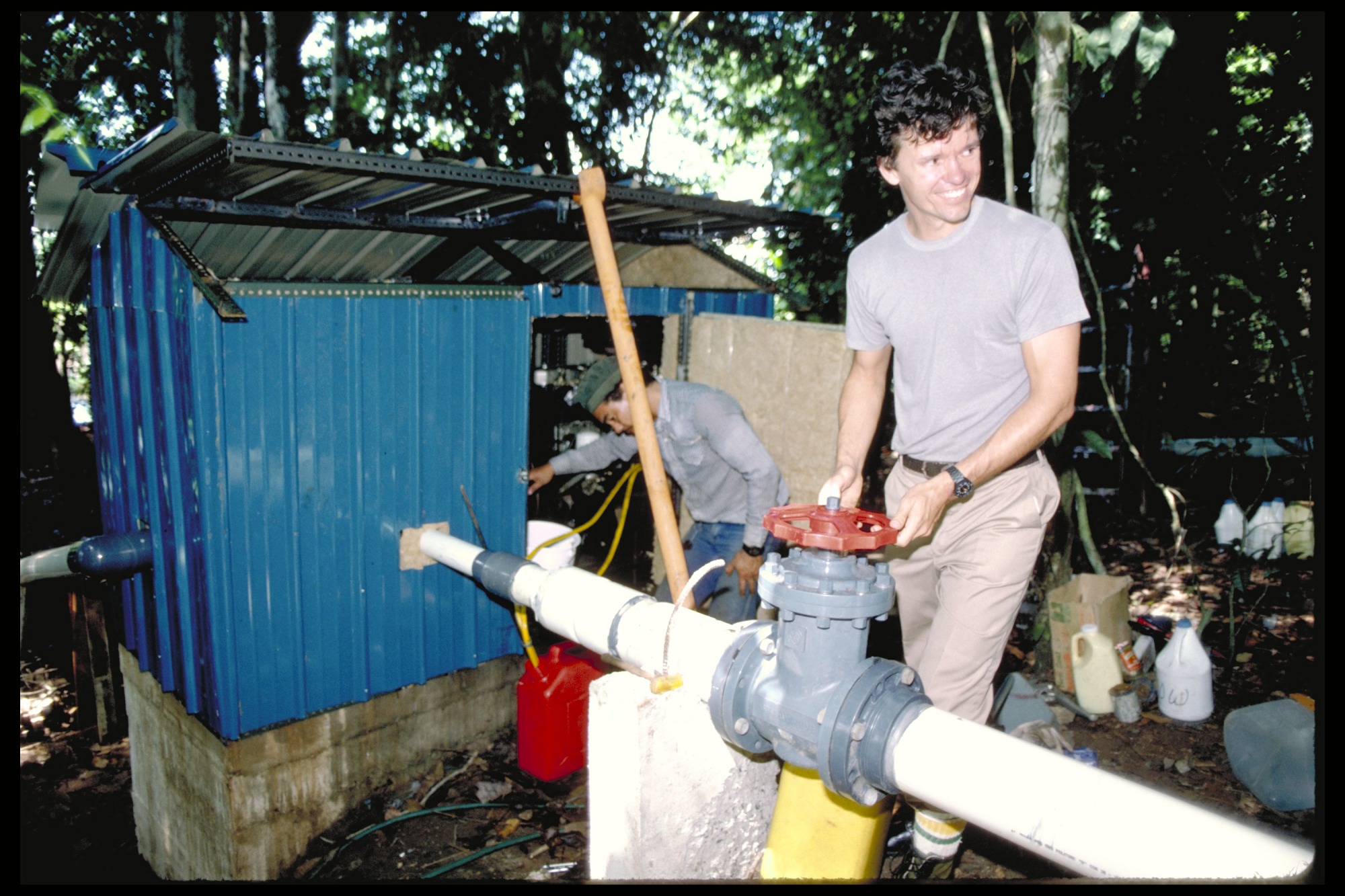 Joe Wright and Carlos Gomez at main valve for forest stand-level irrigation system.