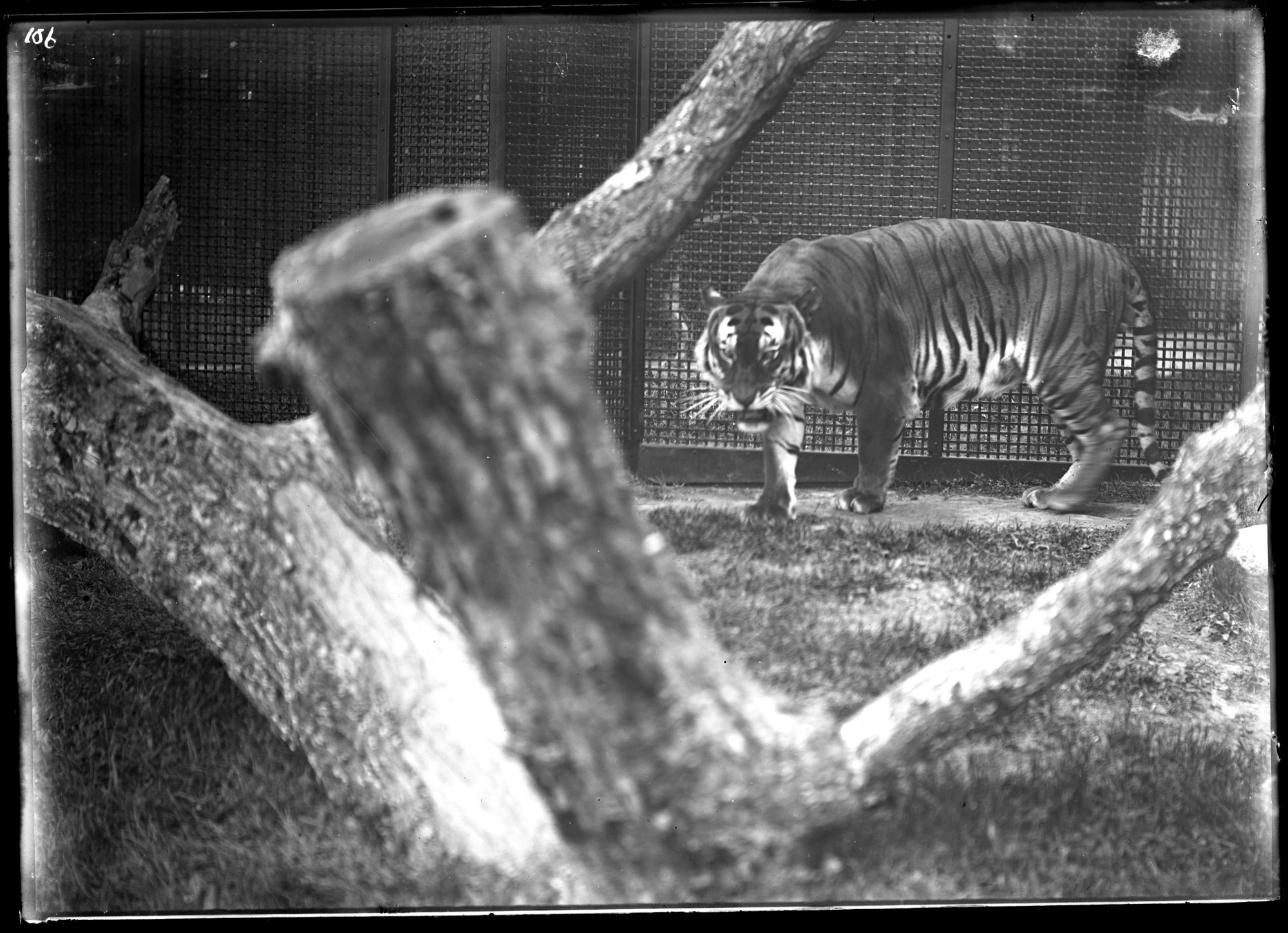 Male Bengal tiger in an exterior enclosure of the Lion House at the National Zoological Park.