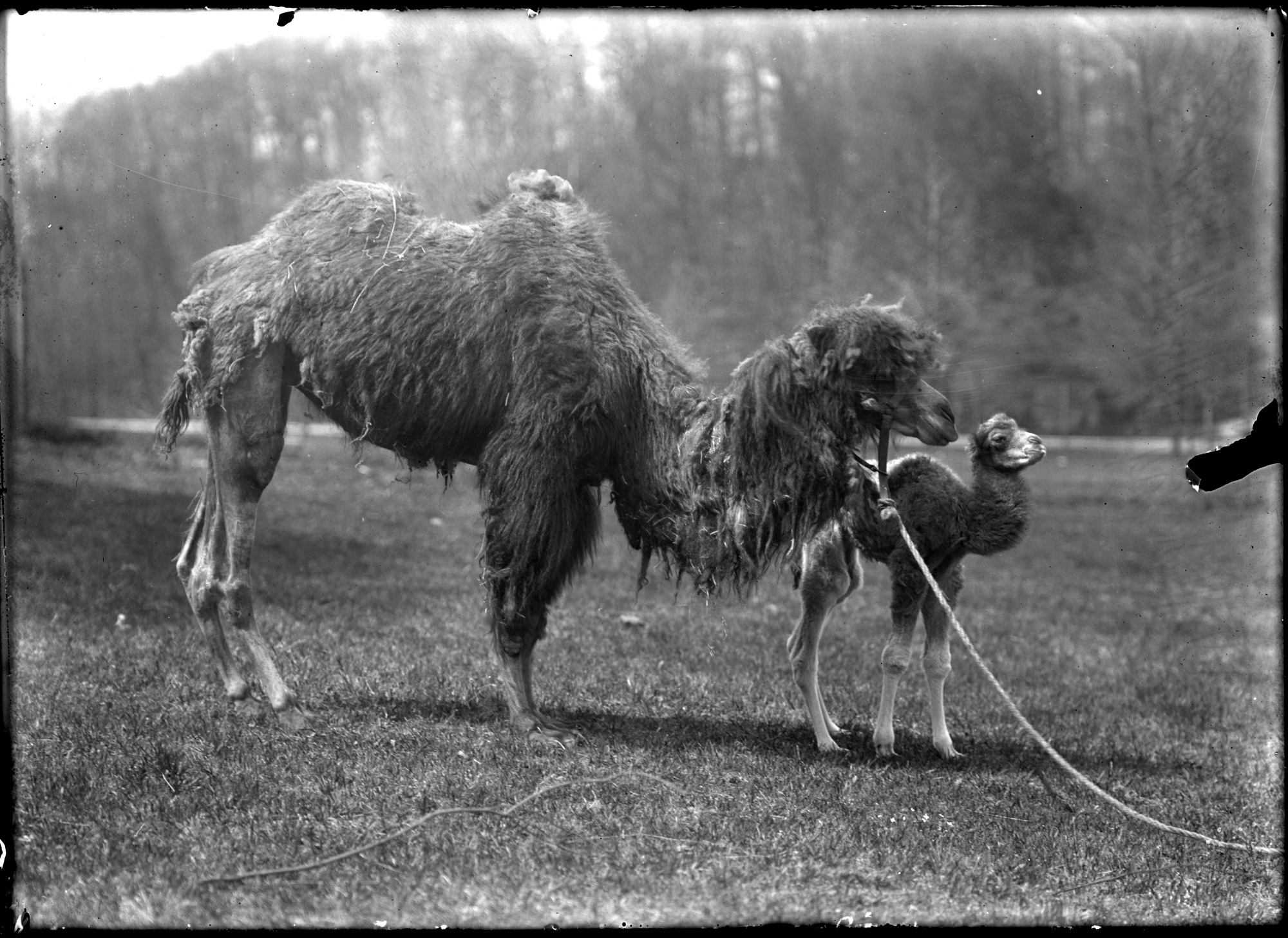 Bactrian camels, mother and calf, in a yard at the National Zoological Park.