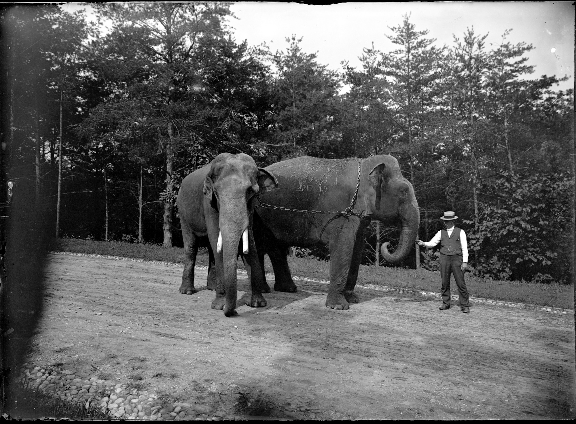 Head Keeper William H. Blackburne leads elephants Dunk (right) and Gold Dust (left) on a road at the National Zoological Park, likely to Rock Creek to bathe.