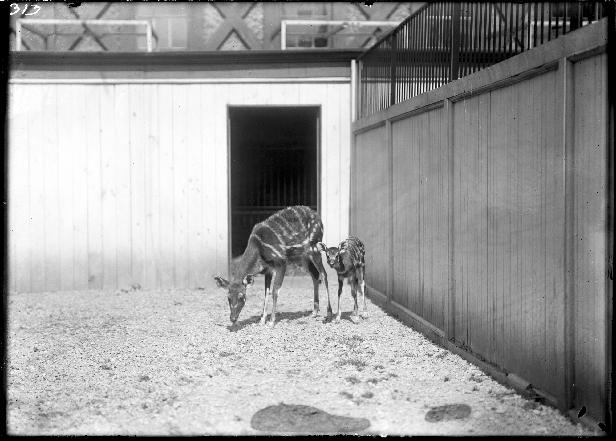 Harnessed antelope, or bushbuck, with calf in yard outside the Antelope House at the National Zoological Park.