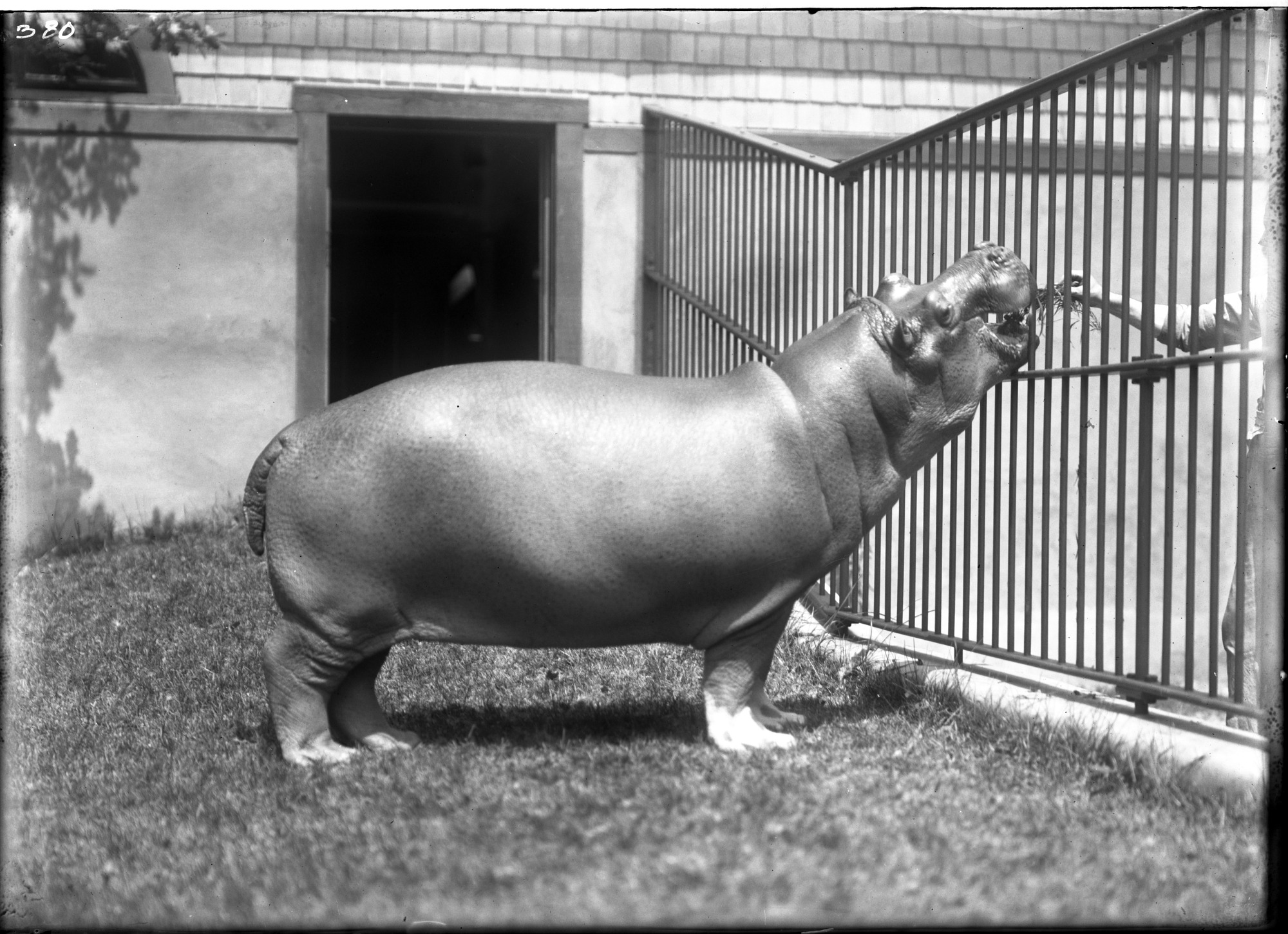Nile hippopotamus juvenile in exterior yard of the Lion House at the National Zoological Park, with keeper's arm in view extending food.