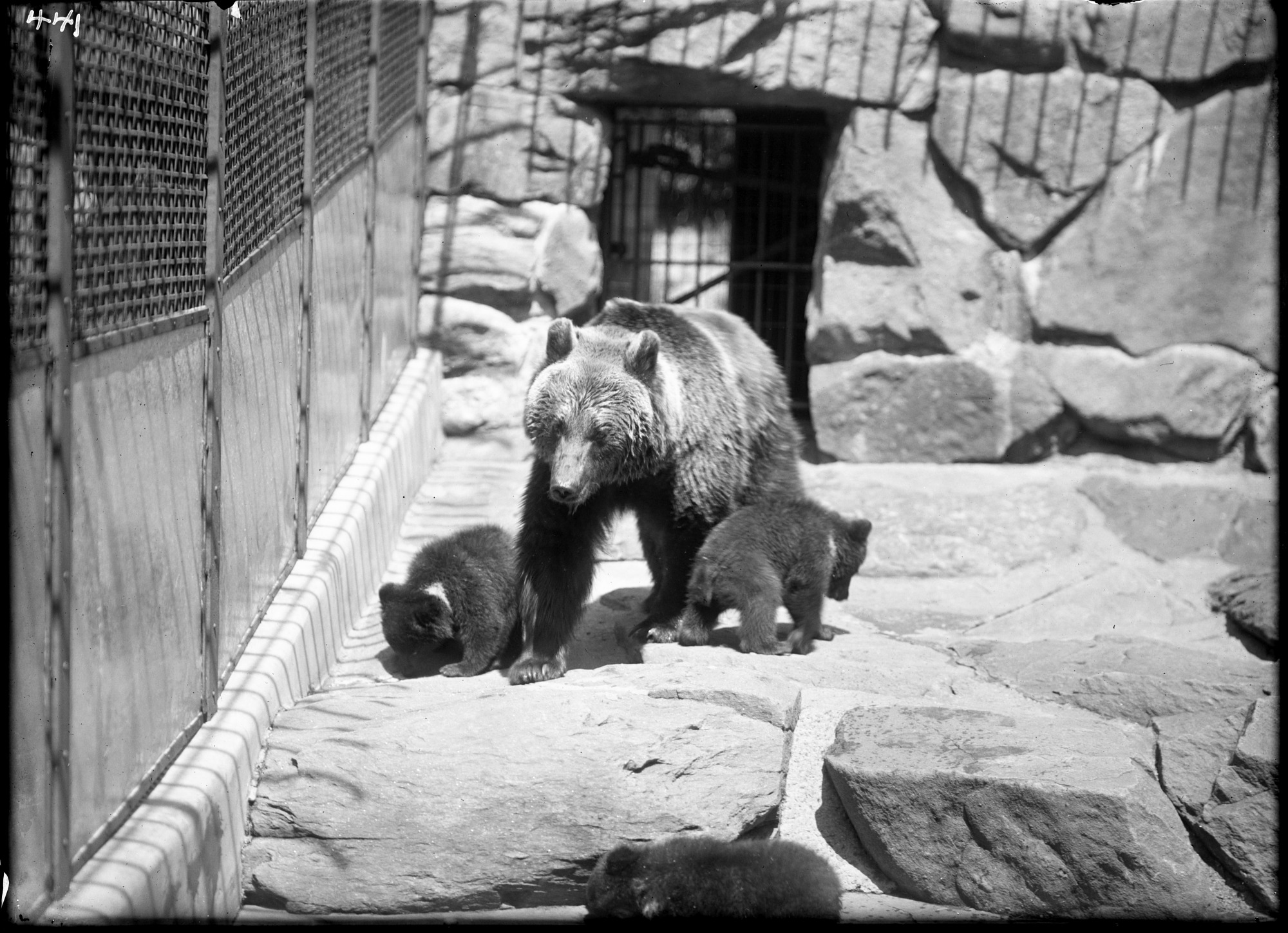 European brown bear mother, "Molly," and three cubs born at the National Zoological Park in their enclosure on the Upper Bear Line.