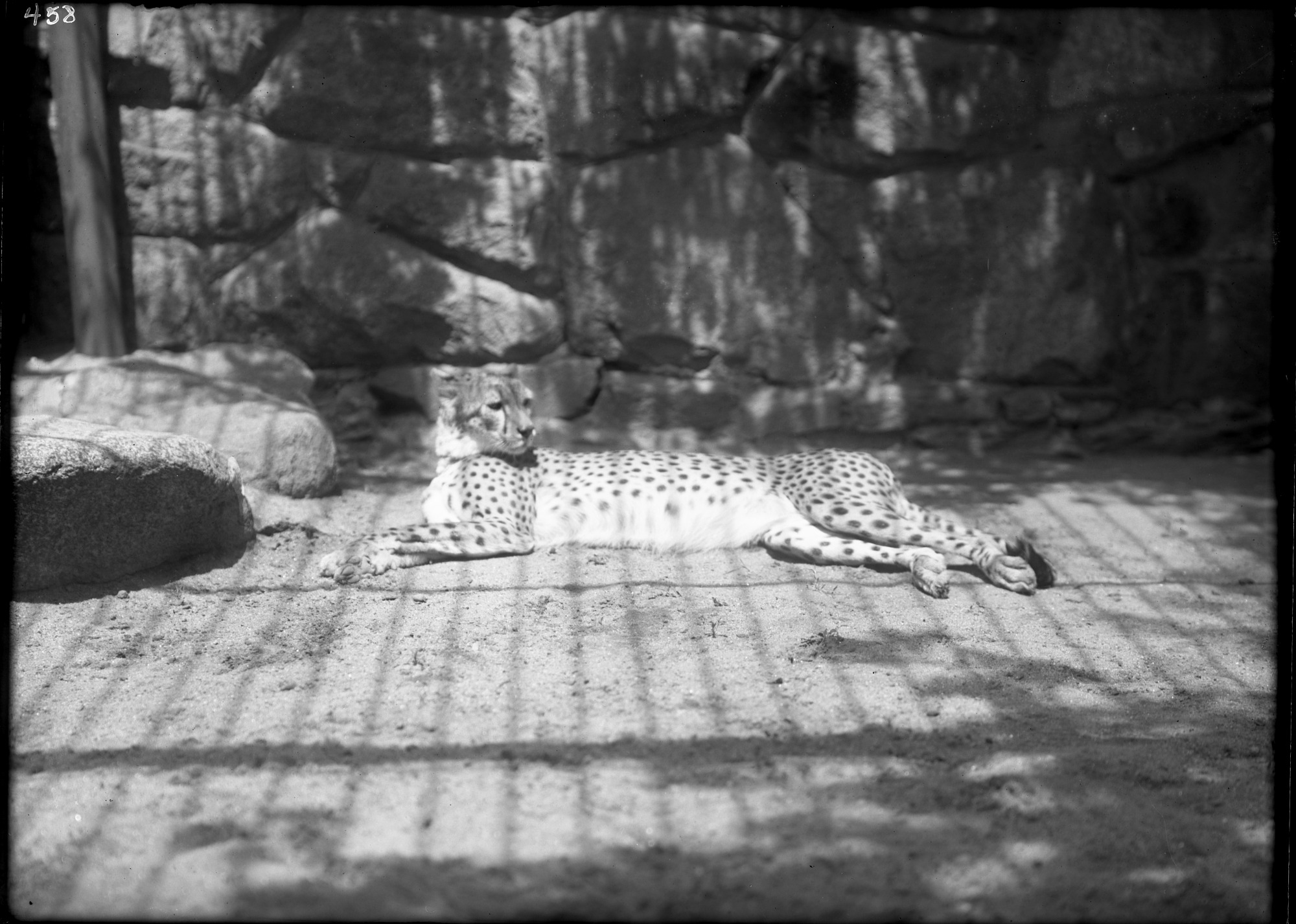 African cheetah lying down in exterior enclosure of the Lion House at the National Zoological Park.