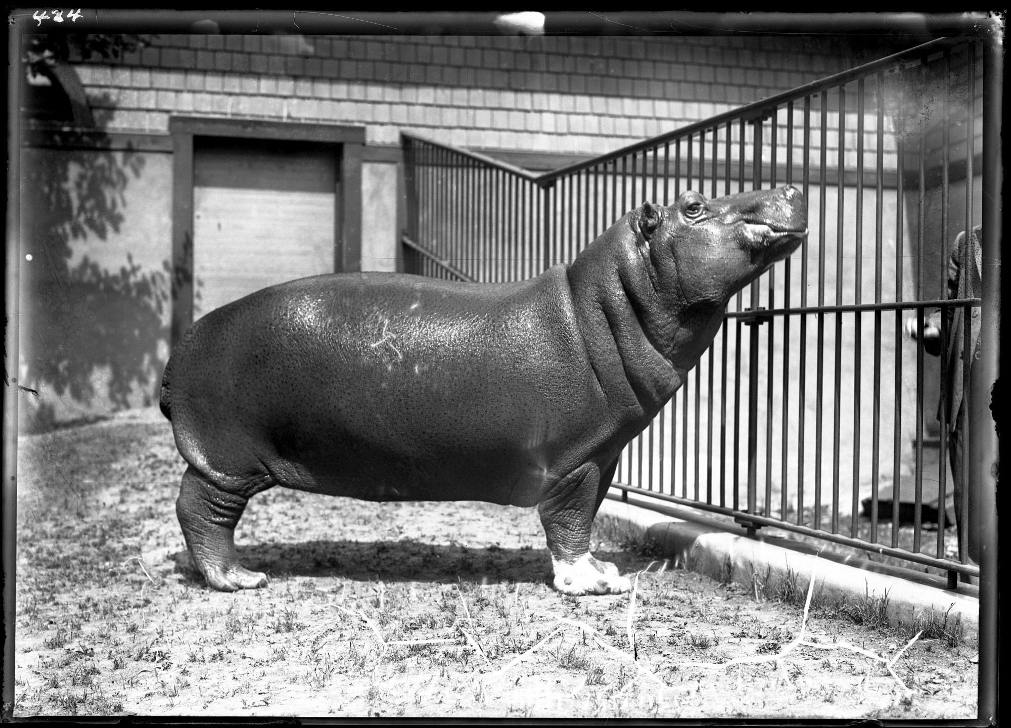 Nile hippopotamus juvenile in exterior yard of the Lion House at the National Zoological Park, with keeper partially in view.