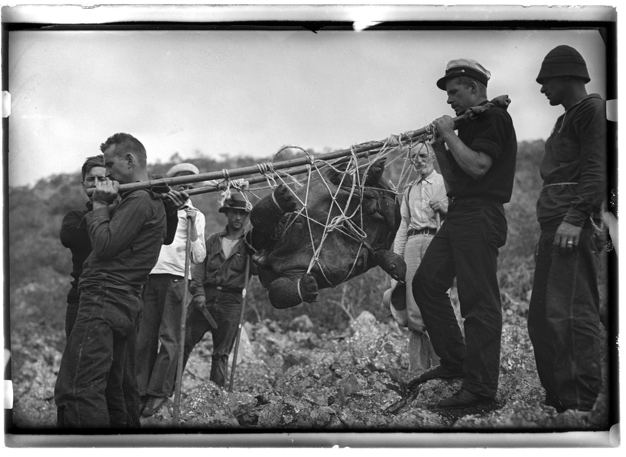 A Galapagos tortoise from Duncan Island is secured for the National Zoological Park on the Pinchot South Sea Expedition, with Pennsylvania Governor Gifford Pinchot.