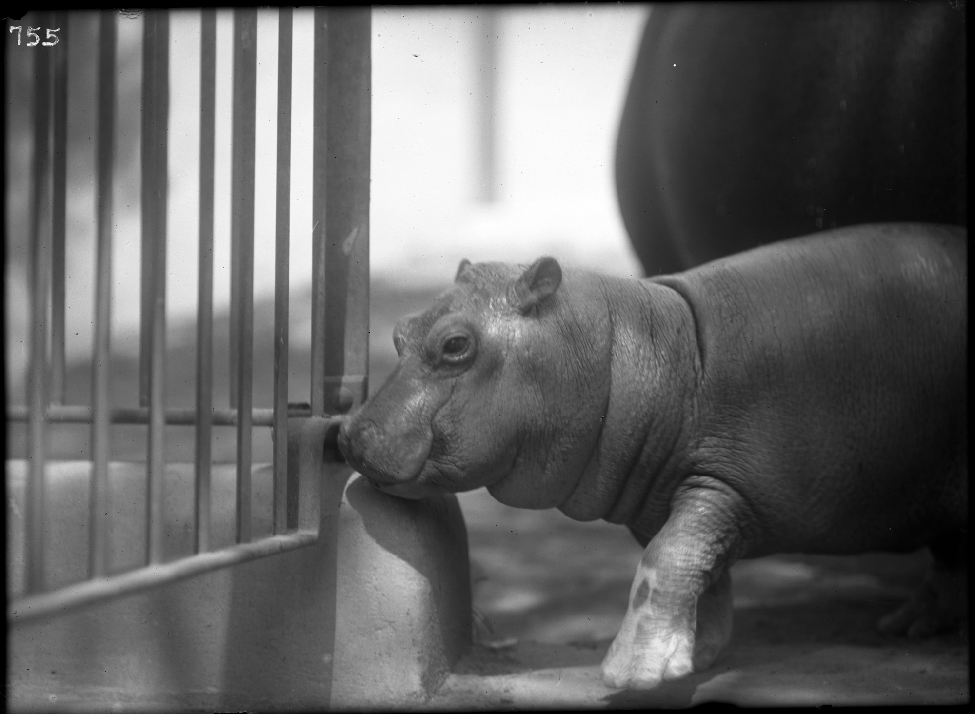 Infant hippopotamus in yard outside the Lion House at the National Zoological Park.