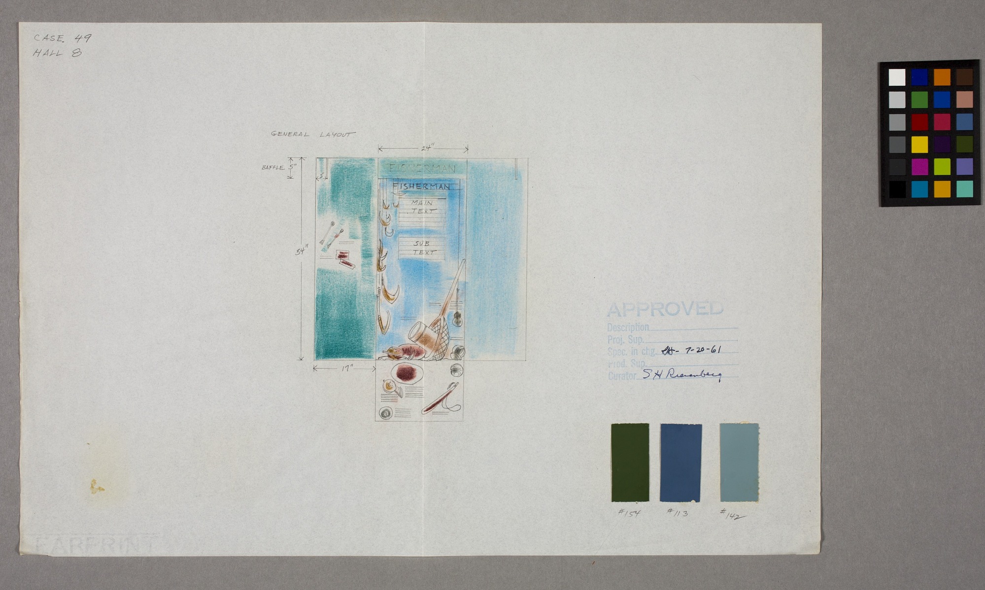 Watercolor sketch of "Fishing" case, which was Case 49 in Hall 8 (Peoples of the Pacific) in the National Museum of Natural History. Paint swatches are included as well.