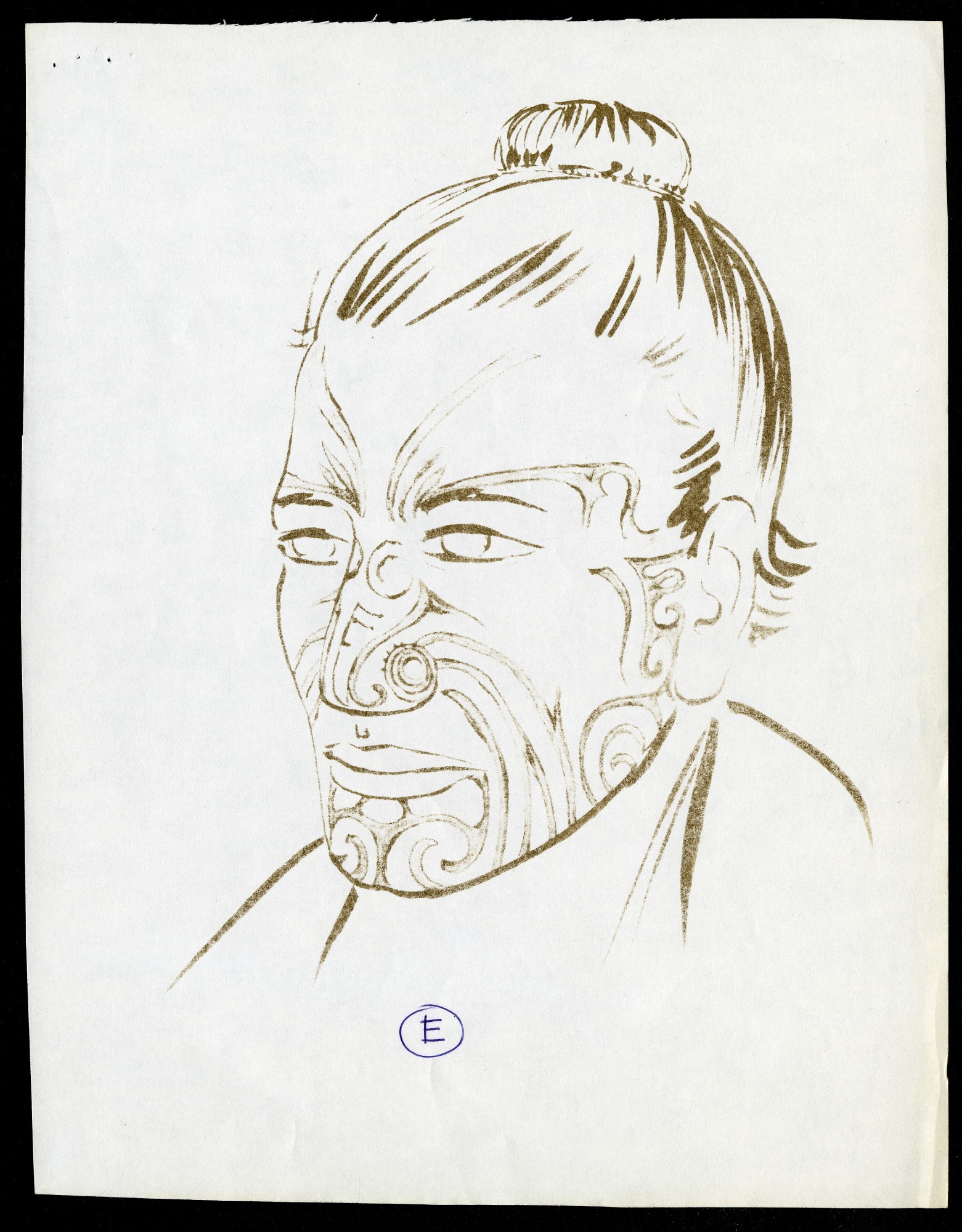 Sketch of mannequin model E to be used in the "Maori Life Group" case, which was Case 48 in Hall 8 (Peoples of the Pacific) in the National Museum of Natural History.