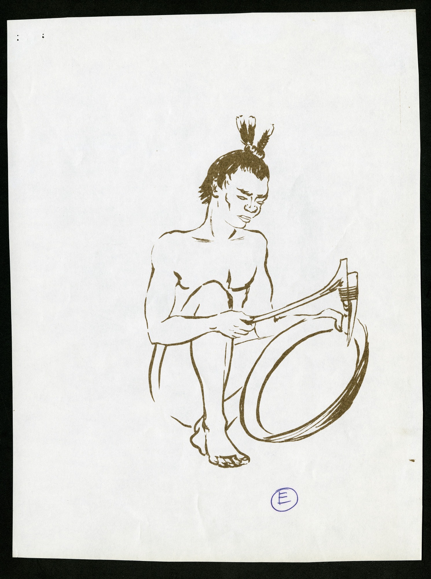 Sketch of mannequin model E to be used in the "Maori Life Group" case, which was Case 48 in Hall 8 (Peoples of the Pacific) in the National Museum of Natural History.