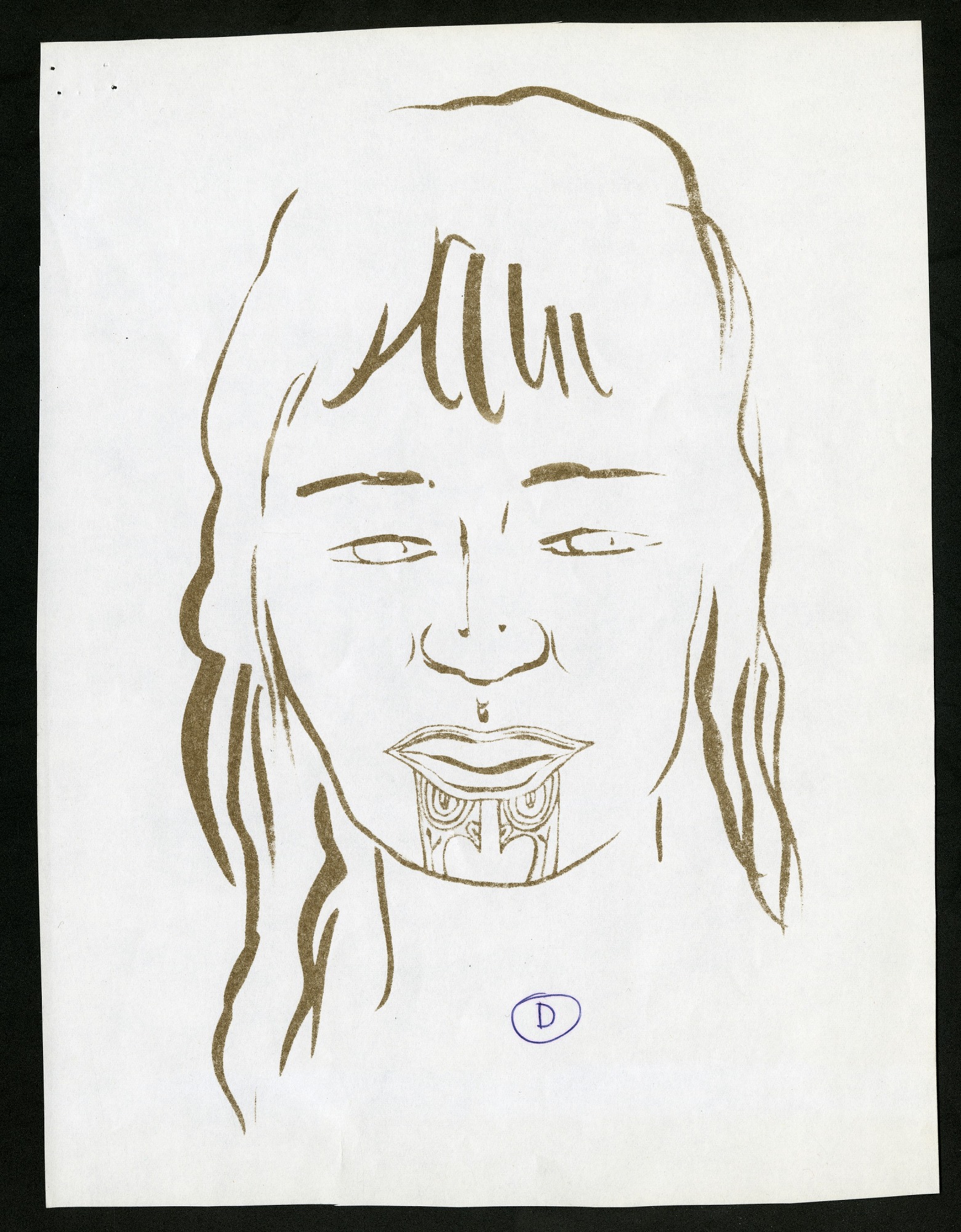 Sketch of mannequin model D to be used in the "Maori Life Group" case, which was Case 48 in Hall 8 (Peoples of the Pacific) in the National Museum of Natural History.