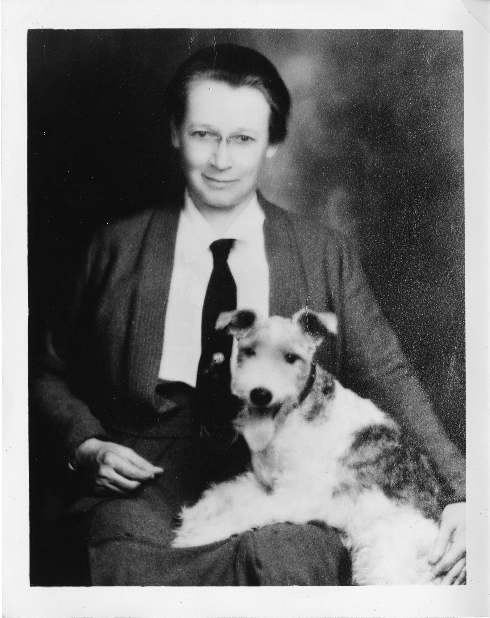 By the 1920s, Eloise Gerry (1885-1970) was considered one of the foremost investigators in wood technology in America and one of few female scientists specializing in research on lumbering, wood utilization, and the turpentining process. After earning a Ph.D. from University of Wisconsin, she spent her career at the U.S. Forest Servicés Forest Products Research Laboratory in Madison. Gerry is shown in this 1936 photograph with her wire-haired terrier Penthesilea ("Penny").