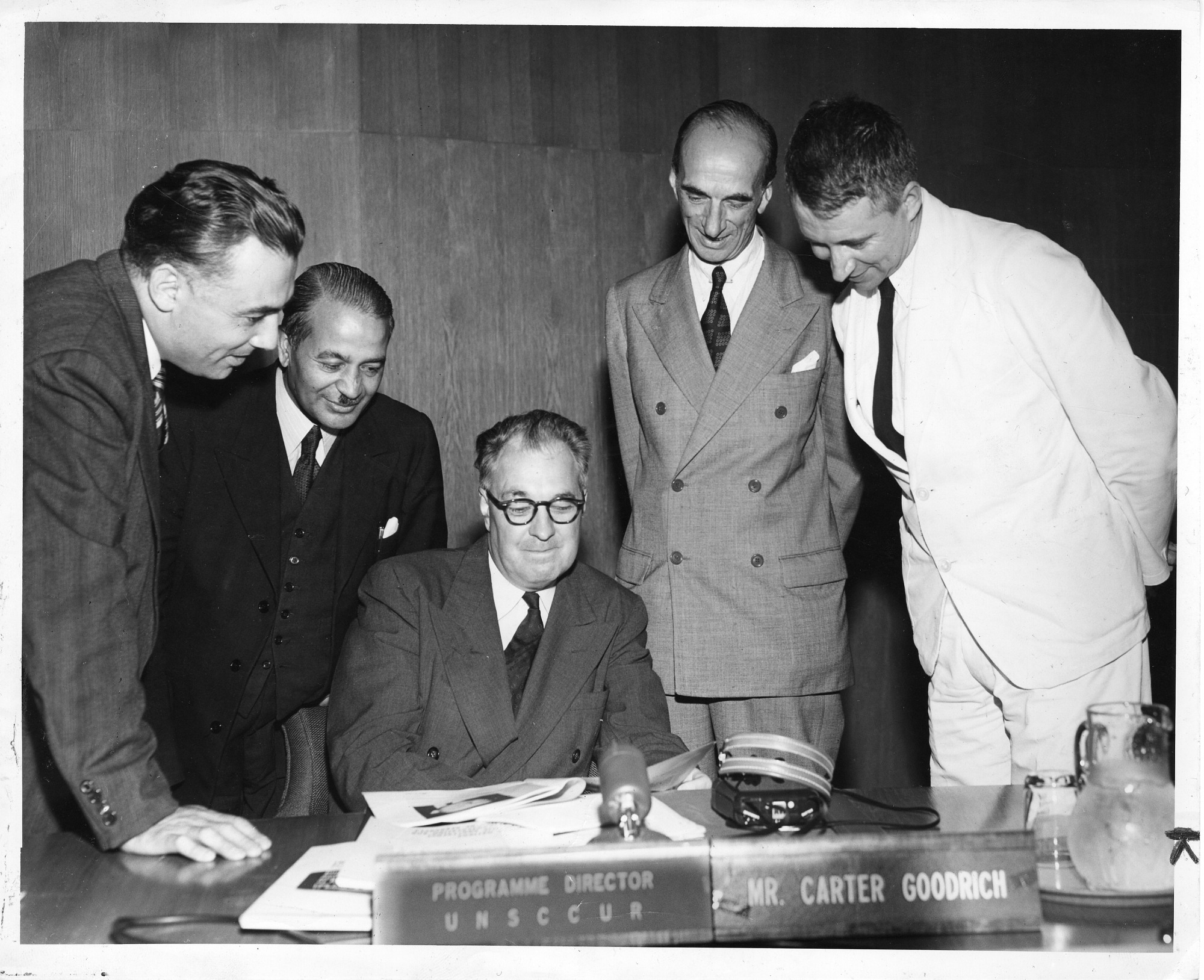 Left to right: Antoine Goldet, Sir Shanti Swarupa Bhatnagar, Carter Goodrich (seated at center), Fairfield Osborn, and Colin Grant Clark