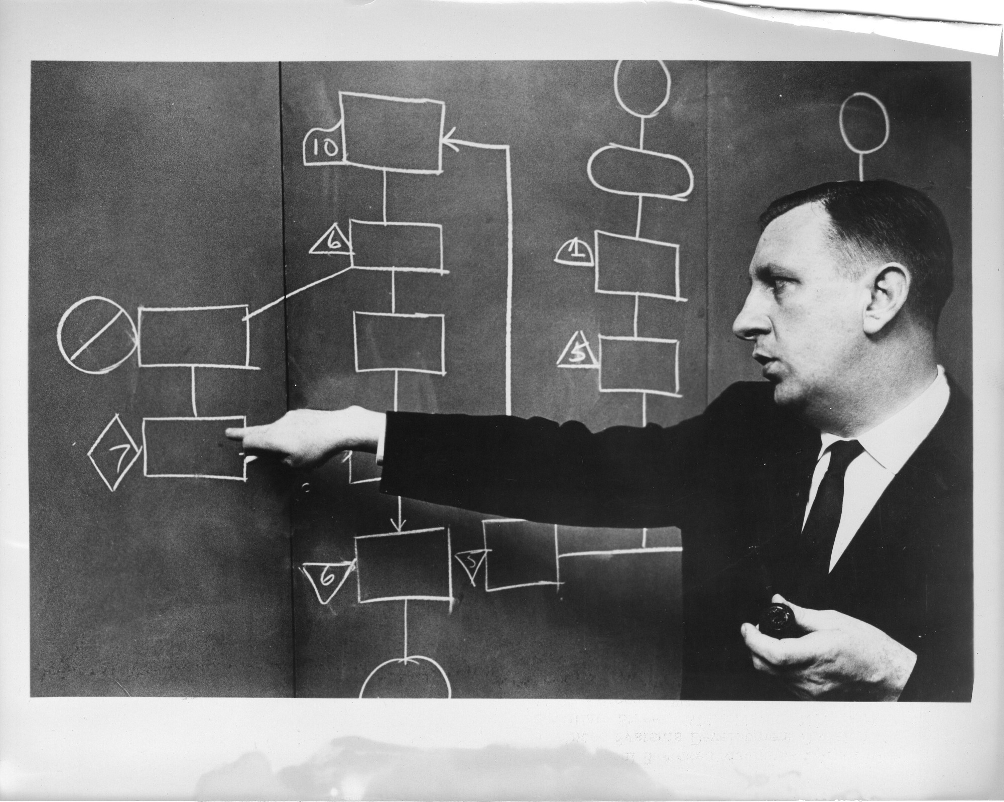 Geoffrey Gordon (1924-1989), manager of simulation development, Advanced Systems Development Division, IBM. Gordon's research focused on "the computer simulation of information handling processes before the processes are actually used in a system." The photograph was taken in September 1961 as Gordon presented a preliminary version of IBM's GPS computer simulation program.