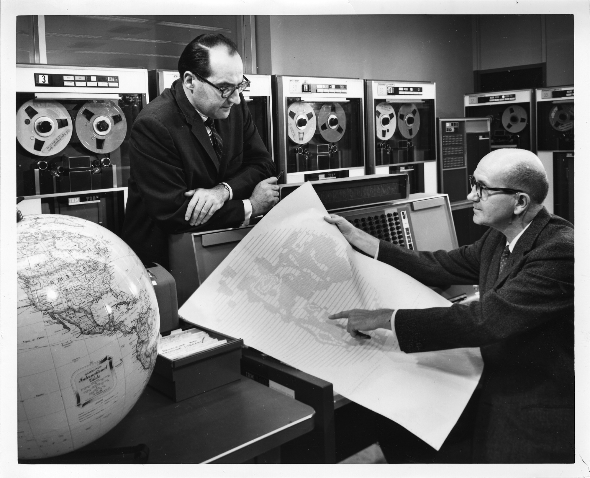 left to right: Joseph Smagorinsky (1924-2005), Chief of the General Circulation Research Laboratory, U.S. Weather Bureau, and Roderick Graham, Assistant to the Chief of the General Circulation Research Laboratory, U.S. Weather Bureau, check a weather flow pattern simulation generated by the Stretch (IBM 7030) computer.