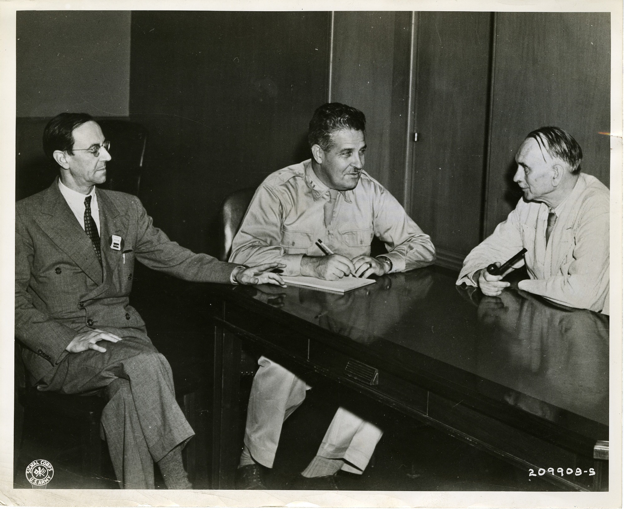 left to right: British physicist and scientific adviser Sir James Chadwick (1891-1974) (left); Major General Leslie Richard Groves (1896-1970) (center), officer in charge of the Manhattan Engineer District; and Dr. Richard Chace Tolman (1881-1948) (right), Professor of Physical Chemistry and Mathematical Physics, California Institute of Technology. This photograph was distributed by the U.S. Government in 1945 as part of its public information campaign after the end of World War II.