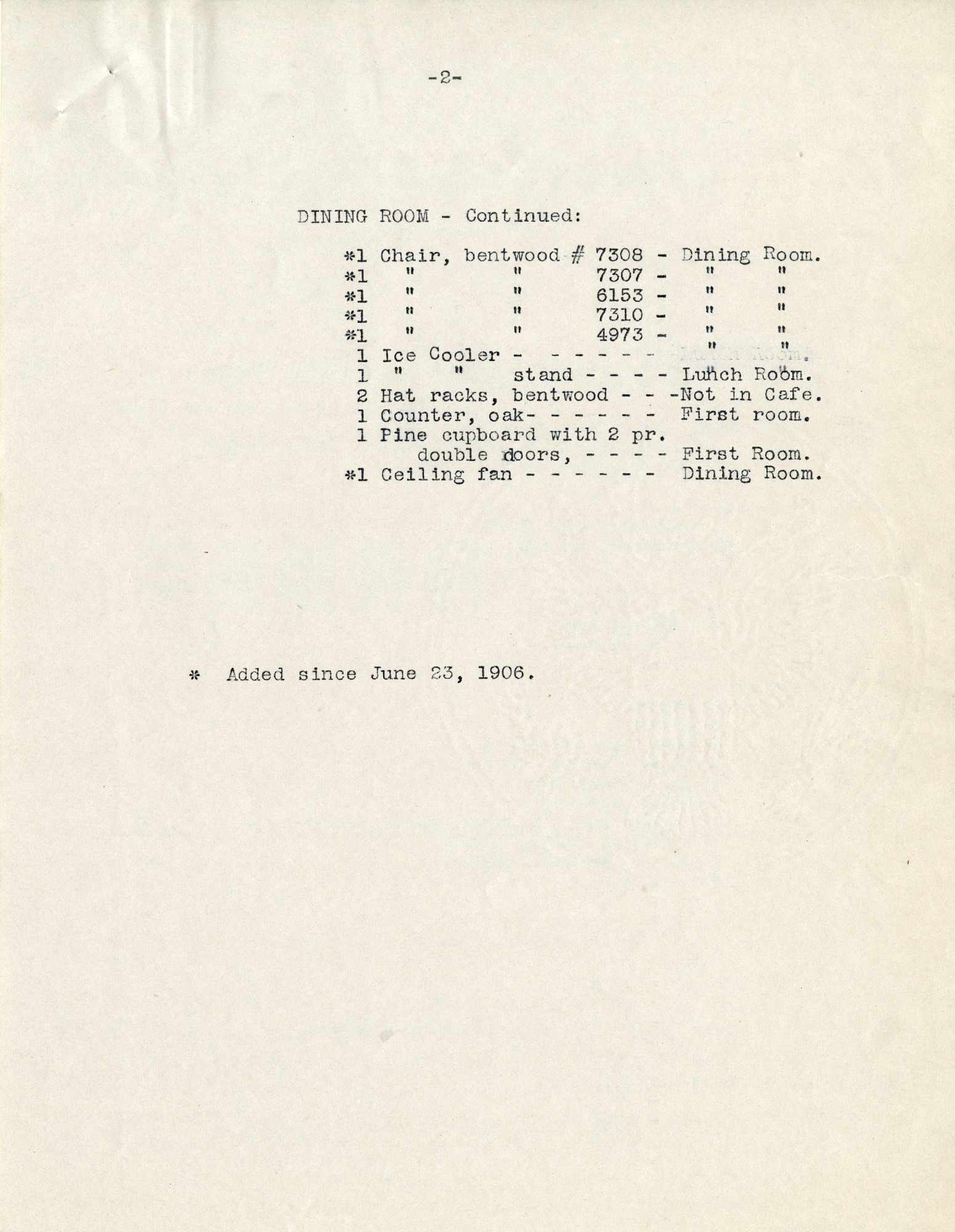 List of the furniture in the Café rooms of the Arts and Industries Building's Café from June 23, 1906, page 2. This list was rechecked May 21, 1913.